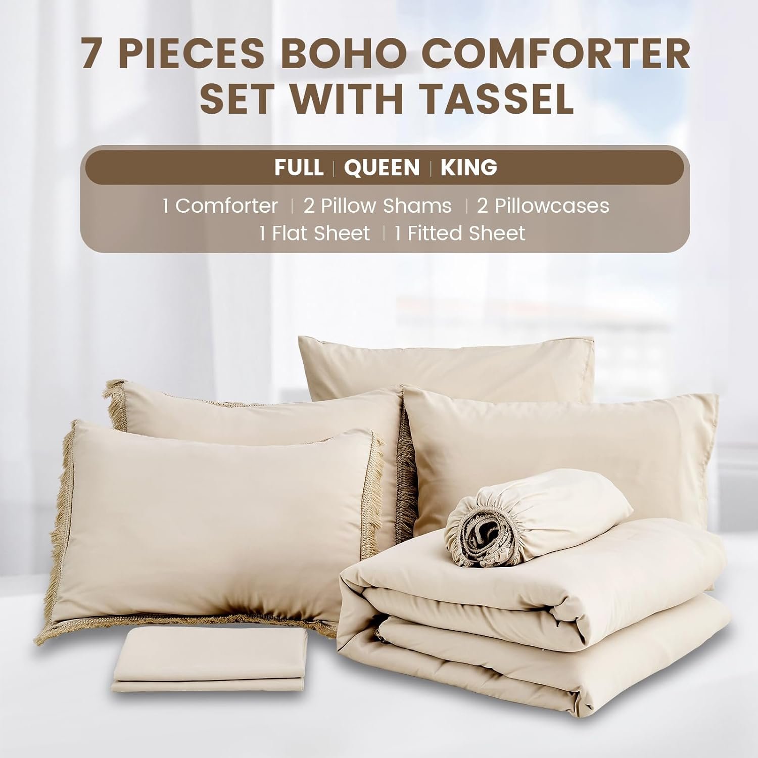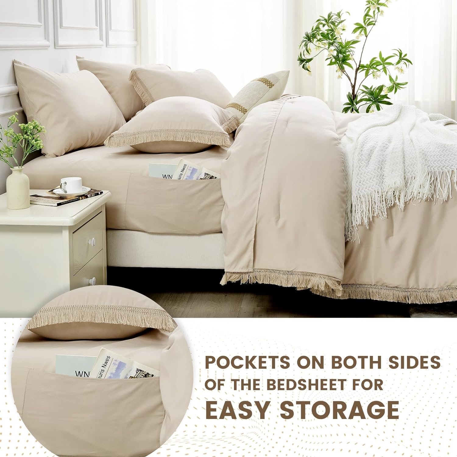 【What You Can Get】This queen size 7-Piece boho tassel tan bedding set in a bag includes 1 Comforter 90″x90″,2 Pillow Shams 20″x30″,2 tassel Pillowcases20″x26″,1 Flat Sheet 90″x102″,1 Fitted Sheet 60″x80″+14″. Our bed in a bag queen is packaged in a vacuum bag, so you can dry it in low heat or tap the comforter gently while baking it in the sun to fluffy again.