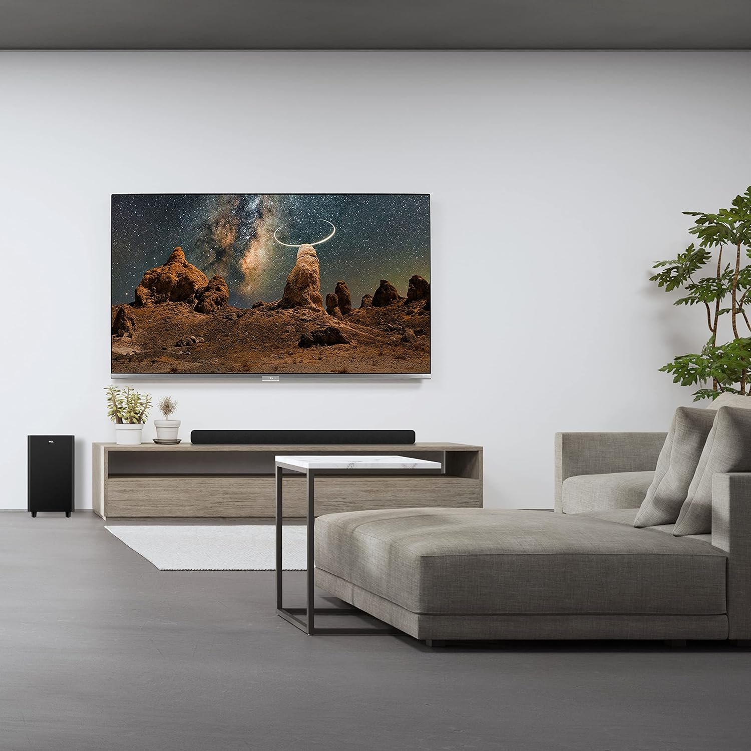 The TCL Alto 8 Plus lets you enjoy powerful, cinema-quality sound at home. Make all your entertainment more dynamic with Dolby Atmos technology, bringing multi-dimensional sound that moves around you for greater depth and excitement. No less than eight powerful drivers create a seriously powerful soundstage that will envelop you in sound—even from above—to give you cinema-like sound without additional components. Listen to clear dialogue with the dedicated center channel that’s been tuned for clarity, so you’ll always be part of the conversation. Experience deep, rich bass to make movies and music truly come to life. Feel the beats in music and the impact of an action scene in movies. Sleek, compact, and wireless, you can place the subwoofer virtually anywhere to adjust your exposure to huge, pulse-pounding bass.