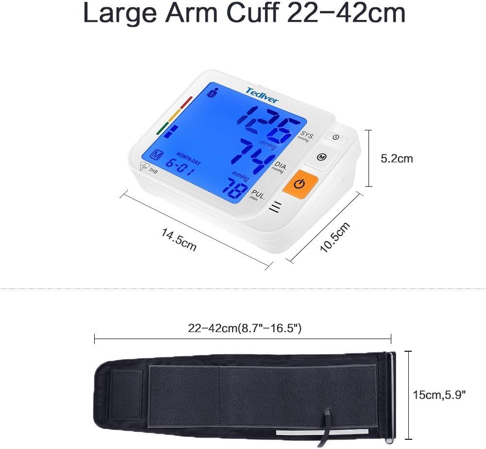 Adjustable & Large cuff fits standard and large adult arms; large backlit LCD screen, extra-large digits and and colored BP Level bar, super easy for you to read and compare blood pressure and heart rate
