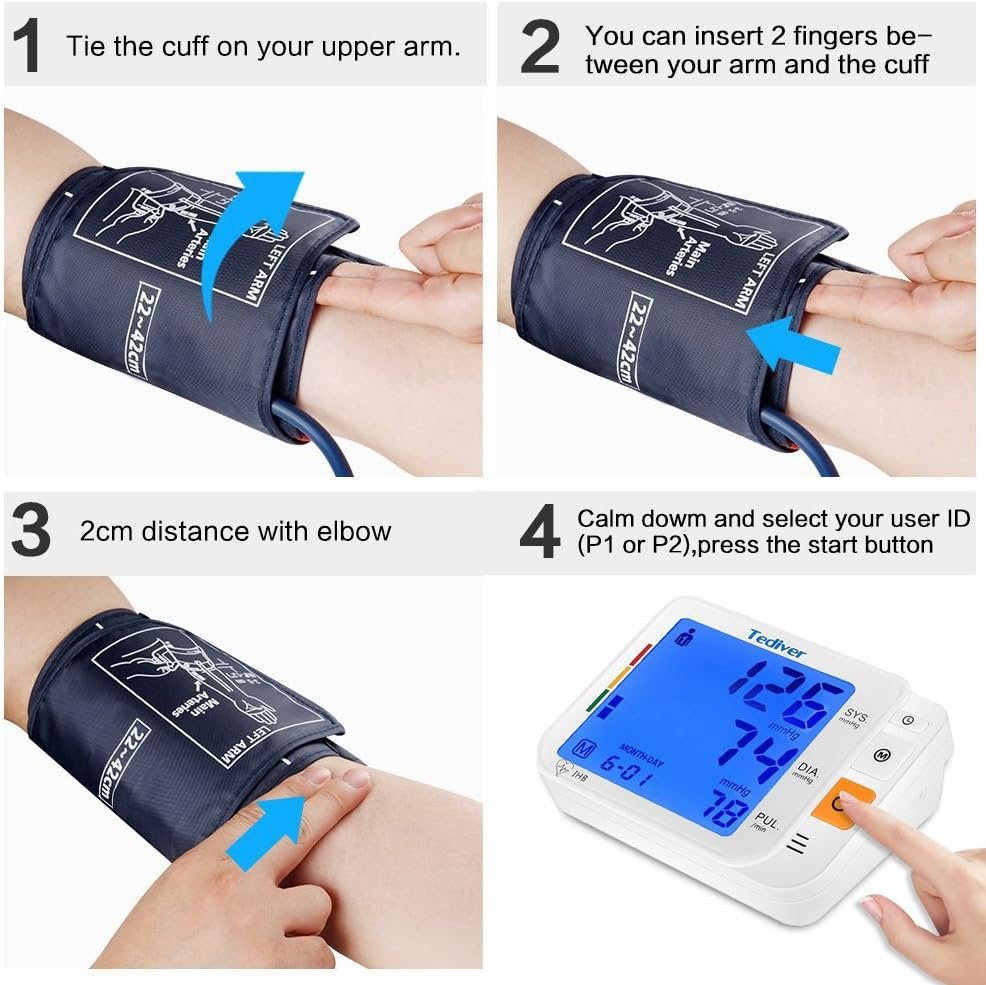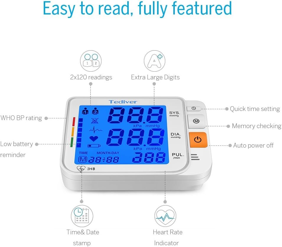 Tediver fully automatic upper arm blood pressure machine utilizes a simple one touch mode, automatically measures your blood pressure quickly and quietly and Two-user mode with 120 memory storage separately allows you and your family to track the readings with date & time stamp