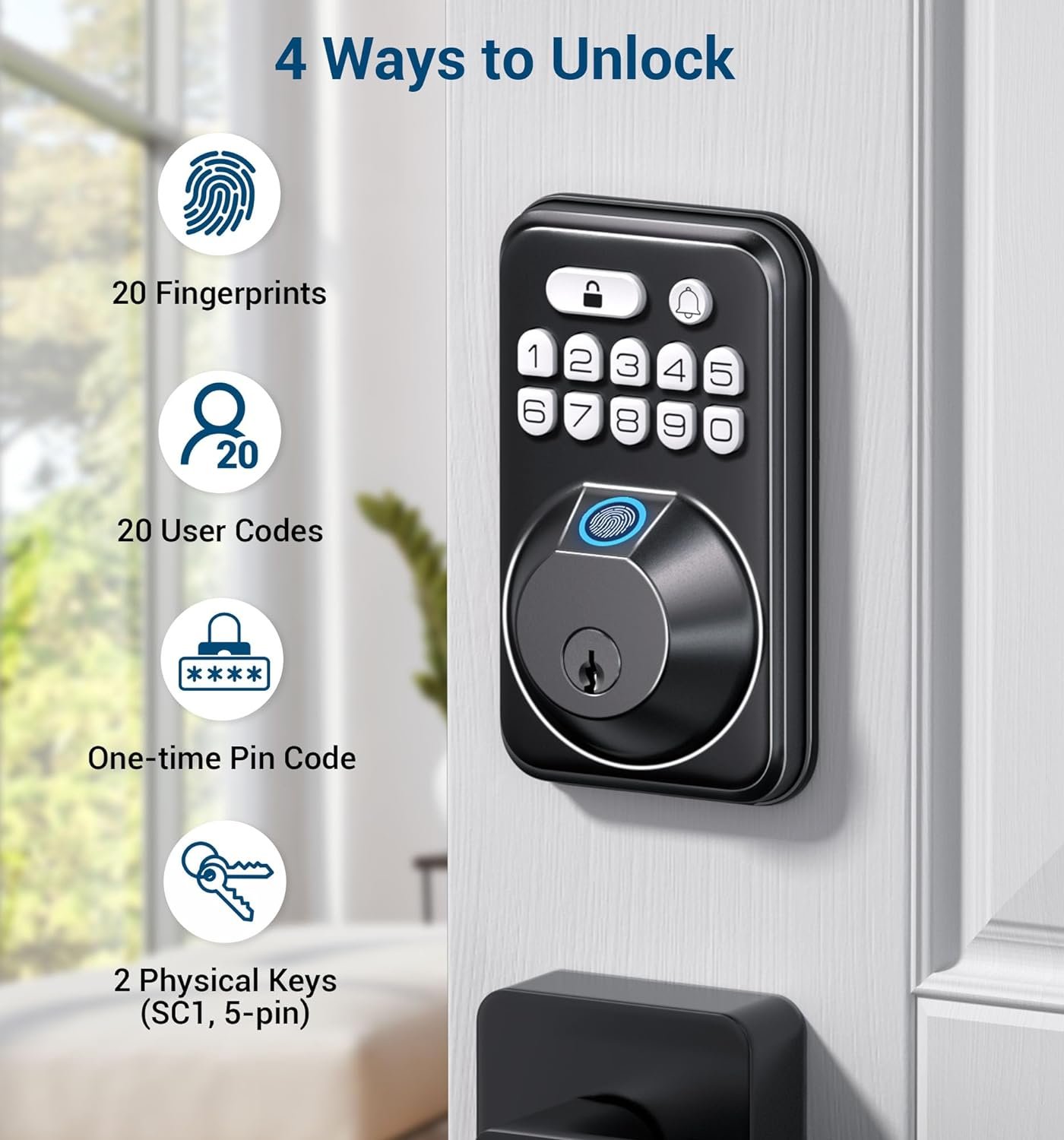 【4 in 1 Keyless Entry Lock】Unlock with up to 20 fingerprints, 20 user codes(including a onetime pin code), or 2 physical keys depending on your convenience. Self-learning AI chip priviedes 0.3s speedy fingerprints recognition. 3 essential code types, including a master code, 20 user codes and a one-time code, ensure a simple code management experience.