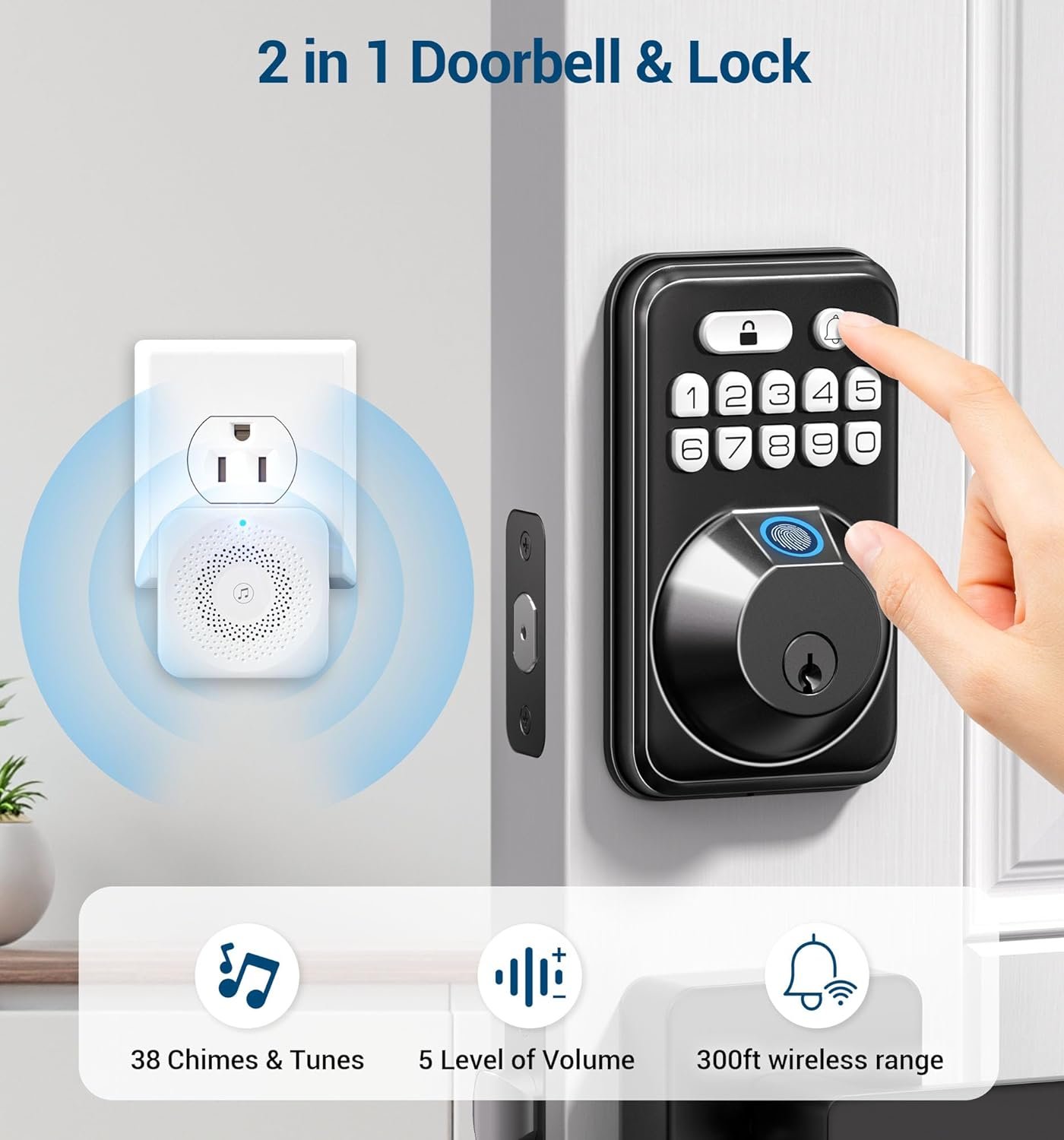 【2 in 1 Smart Fingerprint Lock & Doorbell plus one Chime】Get all at once! No extra doorbell needed. This 2 in 1 doorbell lock and chime set combines a TEEHO smart fingerprint keypad deadbolt lock with built-in doorbell press key and a portable wireless plug-in ring chime with 38 chimes, 5 level of volume from 0-120db, led indicator, and 300ft wirless range.