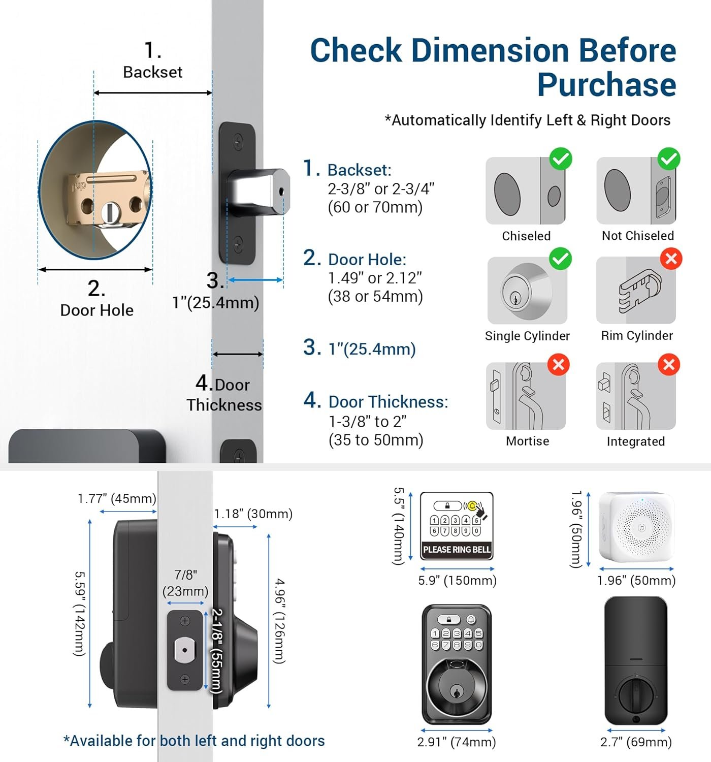【15-Min Quick Installation】 DIY Installation can be done in a breeze with just a screwdriver,no hardwiring required. Hassle-free fit on standard residential doors(35-50mm door thickness, and 38 or 54mm door hole). Automatically identify the direction of the door, compatible with both left and right handed doors.