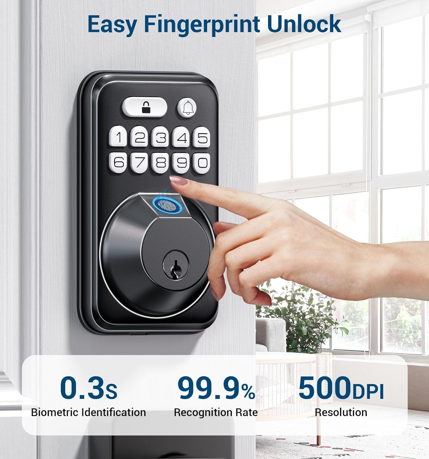 【Ultra Durability & Security】TEEHO Fingerprint Keypad Keyless Entry Door Lock with Doorbell is certified BHMA, ANSI Grade 3 and IP54 weatherproof. Enduring 158℉ to -22℉ high and low temperature resistance, 200,000 Times Keypad life test, 5337N Fastening Screw Pull Test, 100J Face Plate Impact Test, and 240 Hour Salt Spray Test.