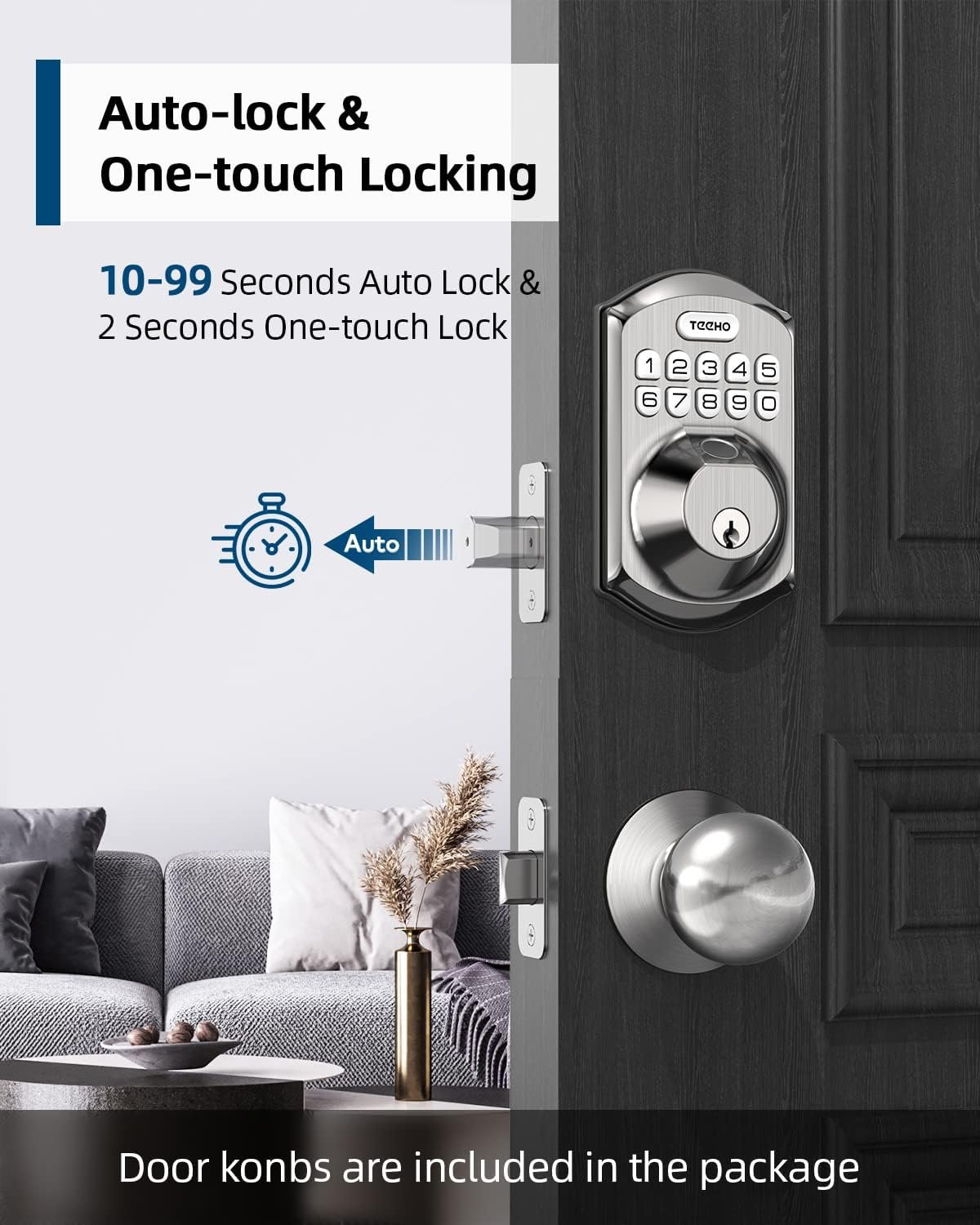 Auto-Lock & One-Touch Lock: Enjoy the convenience of an “automatic door lock” that can be set to lock automatically in 10-99 seconds, or use the “one-touch auto-lock” feature by pressing and holding any key on the keypad for 2 seconds to lock the door.