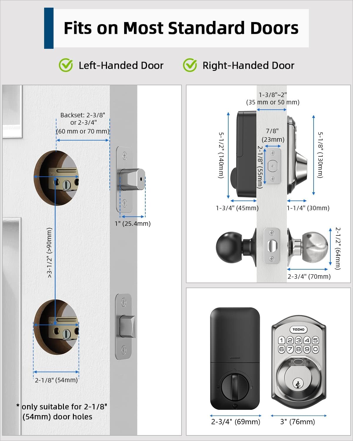 Easy Installation: Installation is a breeze and can be completed in just minutes with a screwdriver. Our deadbolt smart lock is only suitable for 2-1/8″ (54mm) door holes, and is not compatible with 38mm door holes.
