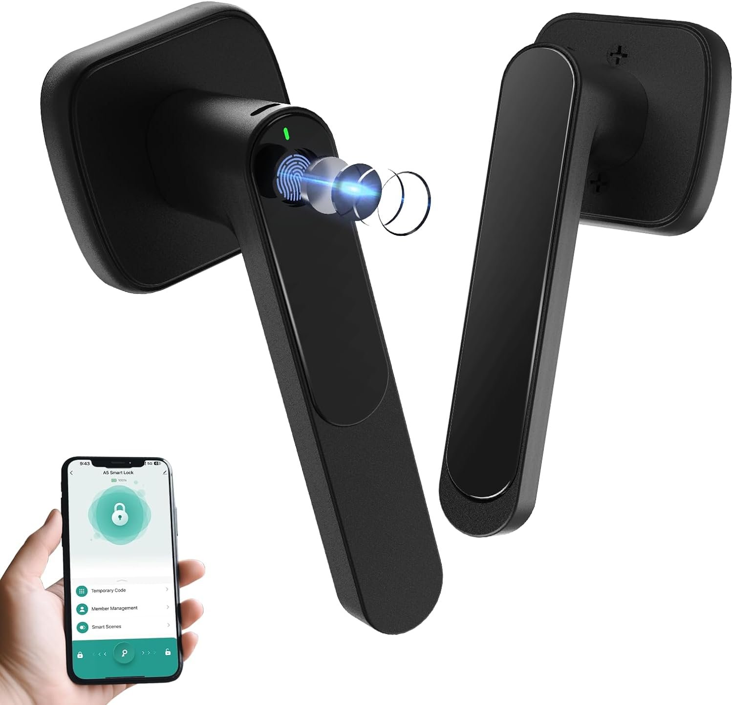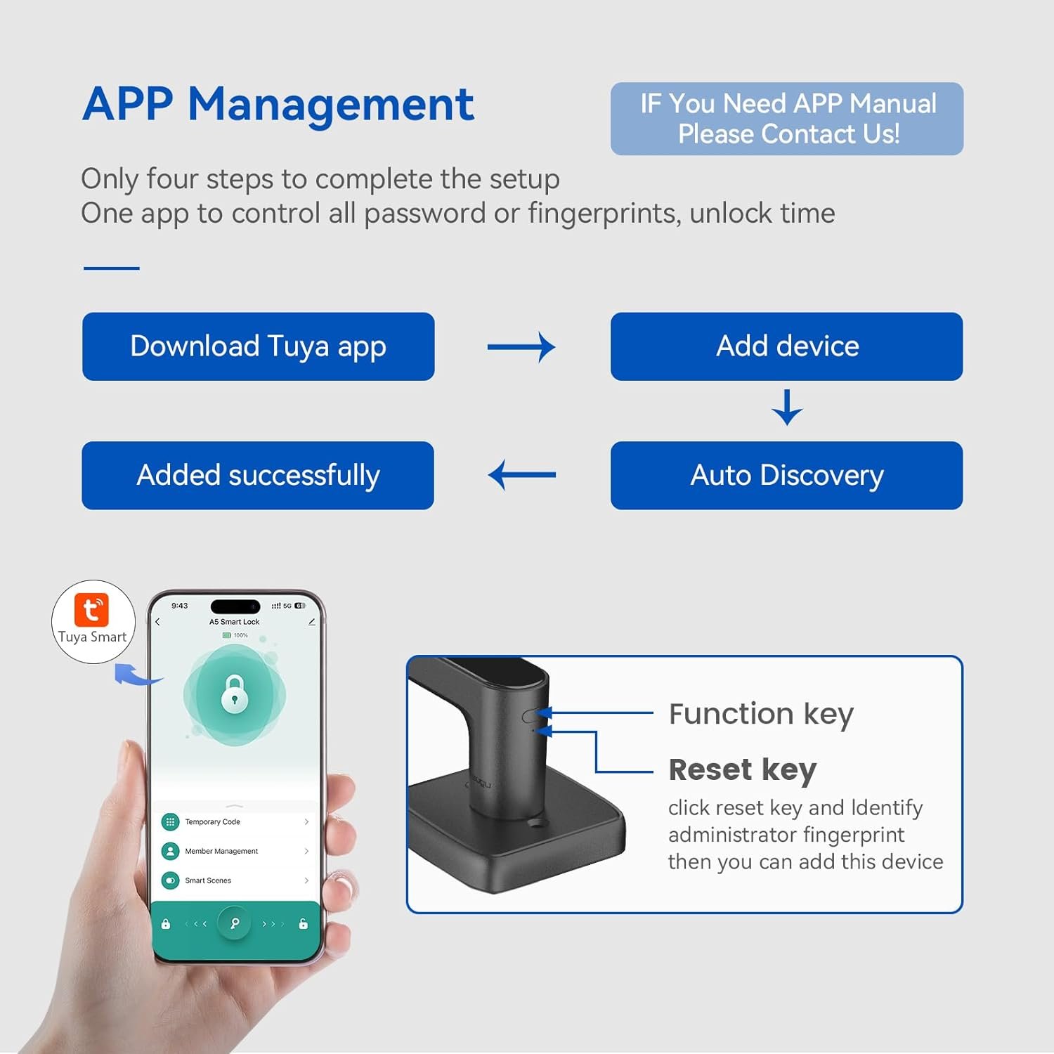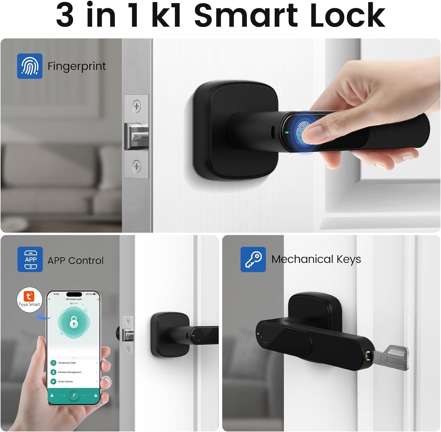 【3-in-1】Three ways to unlock this keyless fingerprint door handle : By using fingerprint(20Pcs in total( 1PCS Administrator + 19PCS Normal User )),TUYA smart APP and mechanical key , you can unlock quickly and safely. Suitable for bedroom home office and airbnb.