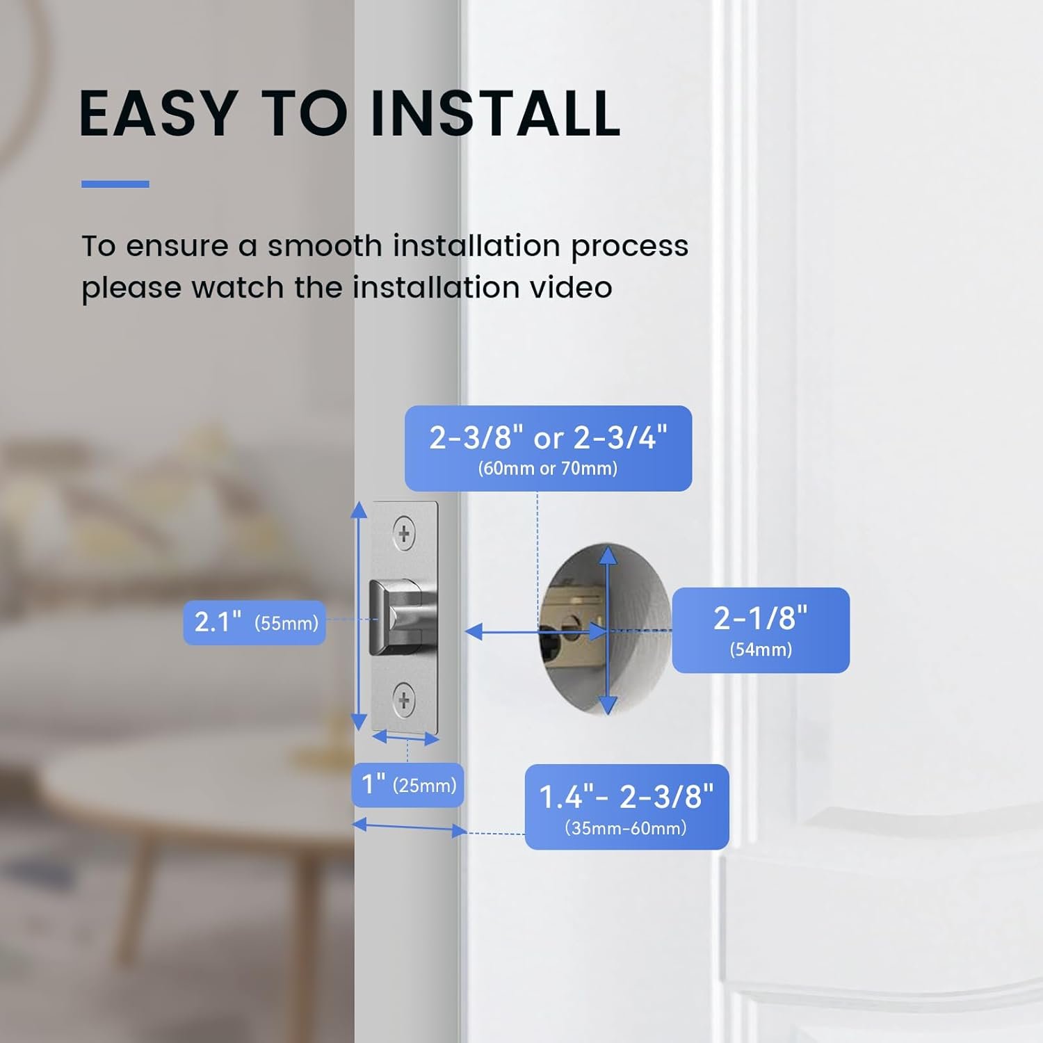 【Easy to Install】Smart door locks are designed to fit US standard doors, backset 2-3/8”(60mm) and 2-3/4”(70mm), door thickness from 1-3/8”to 2-3/8”(35mm -60mm). No wiring or drilling required. Suitable for both left and right handed doors. No extra hole required, install fingerprint door lock yourself with a screwdriver.