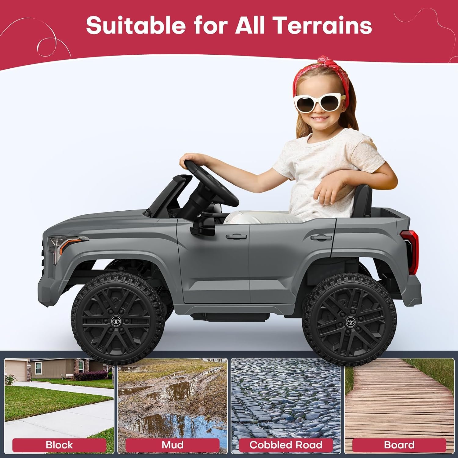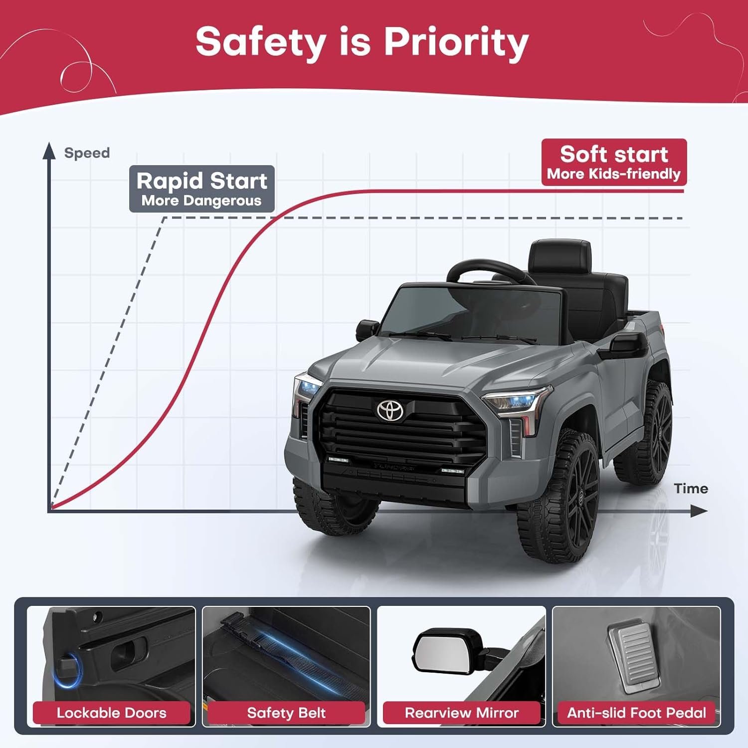 [Safety is Top Priority] Except for the remote control, this ride-on car also comes along with 4 wear-resistant PP plastic tires, spring suspension system, power wheels with greater grip,and 2 lockable doors, which can maximize the safety of children while driving on various terrains. The safety belt and soft start design from the ride on truck prevent kids from startled of a sudden acceleration.