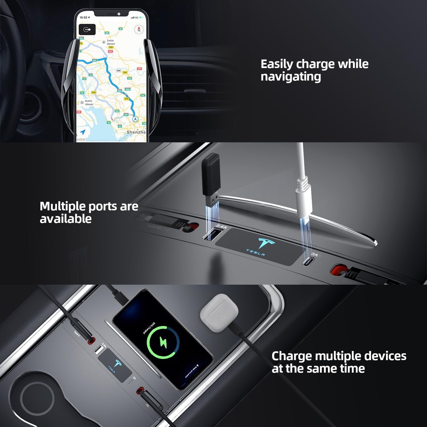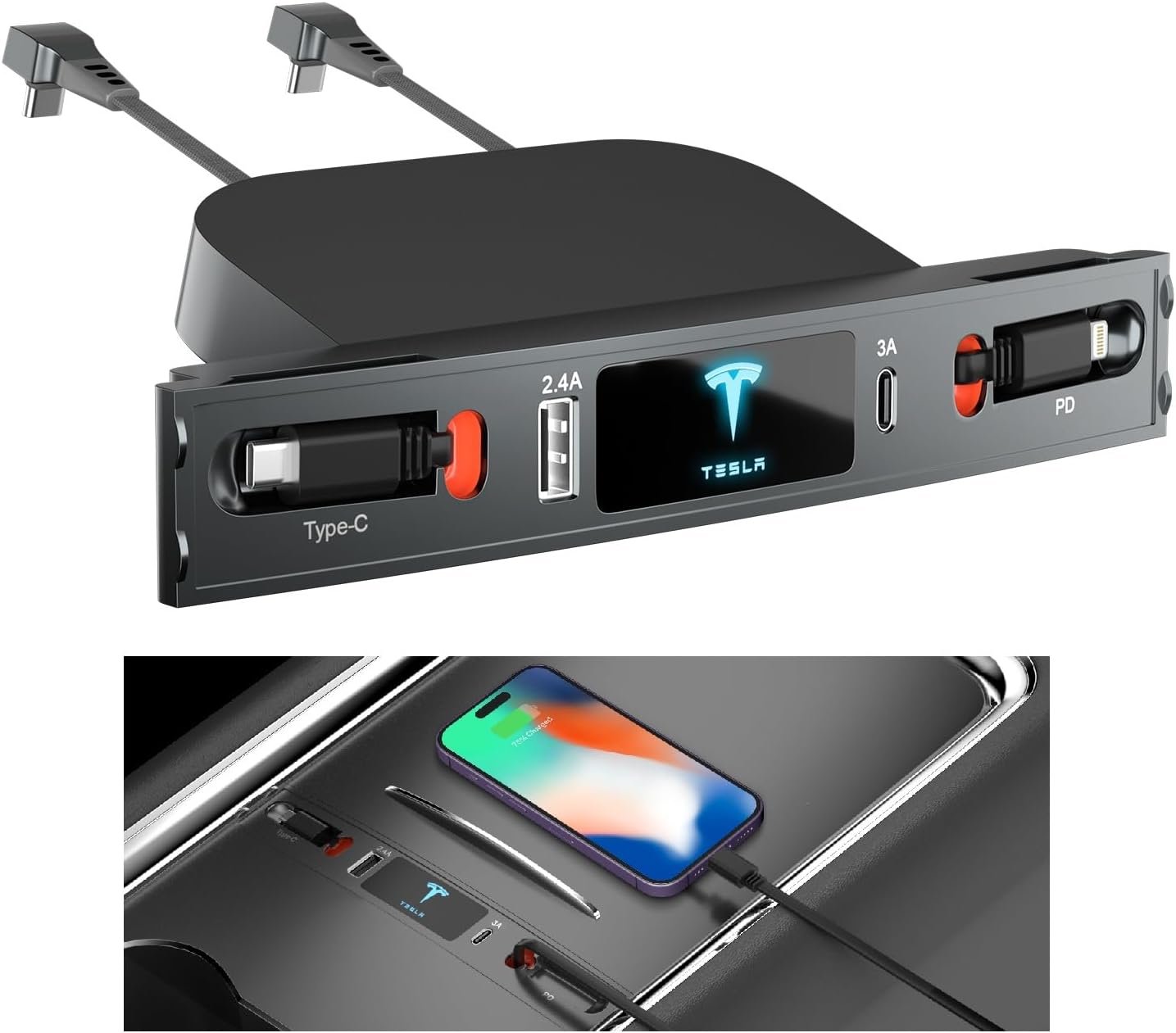✅【Retractable Fast Charging Cable】The tesla usb hub with a retractable fast charging cable, the type-c1 has a maximum of 18W fast charging, and the Apple PD port supports a maximum of 27W fast charging, saying goodbye to slow charging. The charging cable is 31.5 inches long and can be easily retracted to make the car more tidy.