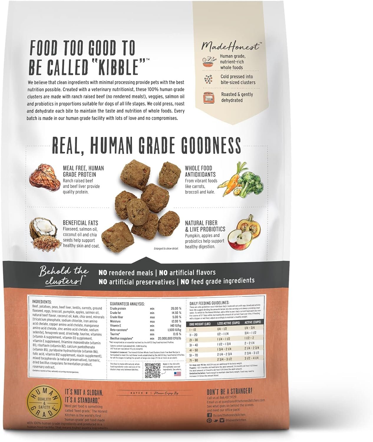 We believe that human grade, minimally processed whole foods provide pets the best nutrition possible. Created with a veterinary nutritionist, these 100% human grade clusters are made with real whole foods you’d recognize from your own kitchen, like ranch raised beef. They’re MadeHonest with human grade, nutrient-rich ingredients, cold-pressed into bite sized clusters, roasted and dehydrated to maintain the nutrients, aroma and taste of whole foods. Our Grain Free Beef Whole Food Clusters give you the same scoop & serve convenience as other dry dog foods, while giving your pup minimally processed, 100% human grade taste and nutrition. *Substantiated by In-Home AAFCO Feeding Trial ABOUT THE HONEST KITCHEN Founded in 2002 as the first human grade food for pets, we believe that real, whole foods provide pets with the best nutrition possible. That’s why all our foods are made with the same quality and safety standards as people food (and with ingredients you can find in your kitchen). It’s what we call The Honest Difference, and we can’t wait for you to see the difference it makes!