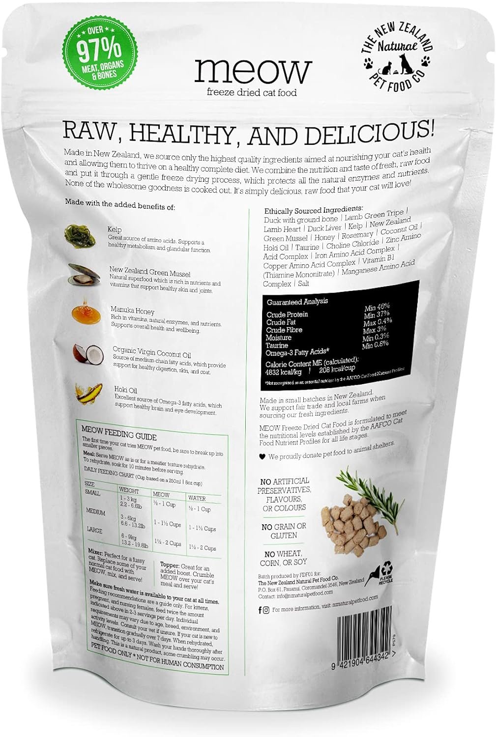 MEOW Duck Freeze Dried Cat Food is made using only the highest quality ingredients aimed at nourishing your pet’s health. MEOW combines the nutrition and taste of fresh, raw food by gently freeze-drying to protect all the natural enzymes and nutrients, so none of the wholesome goodness is cooked out. Raw, Natural, and Delicious!