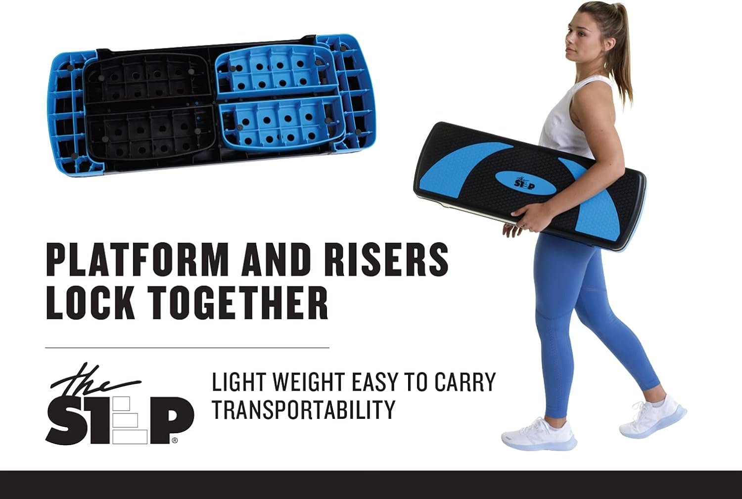 Adjustable risers challenge workout by increasing platform height from 4″ to 6″ to 8″