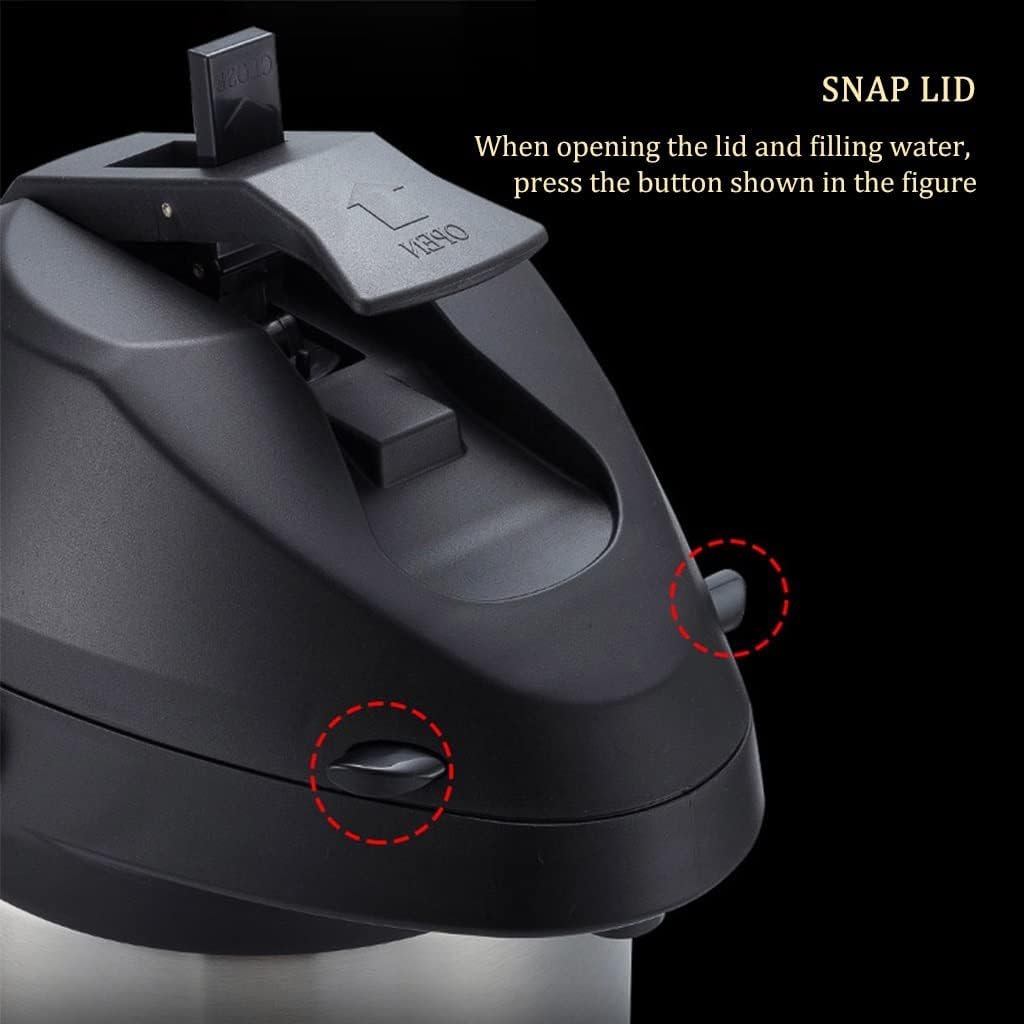 Food grade 304 stainless steel inner layer, locks the heat in the pot. Stainless steel pneumatic suction rod. Anti-mistouch switch, humanized safety design. Snap lid. 360 free rotating base, easy to take water when placed on the table in any direction.
