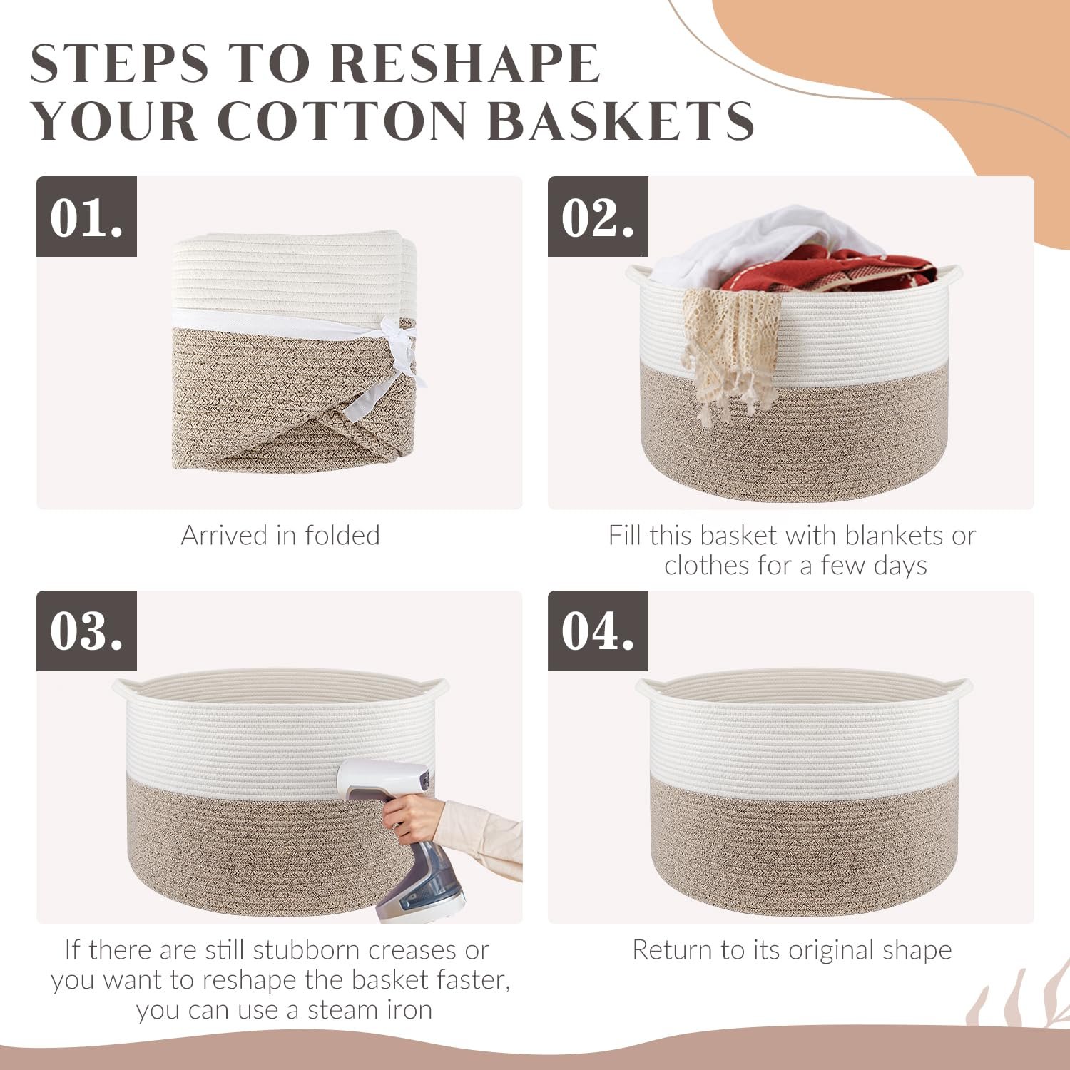 Note: Hand washable or machine washable. When machine washing, please put the basket in a laundry bag. The basket is arrived in folded, you can fill it with blankets or clothes to reshape its shape, ironing is also a good way.