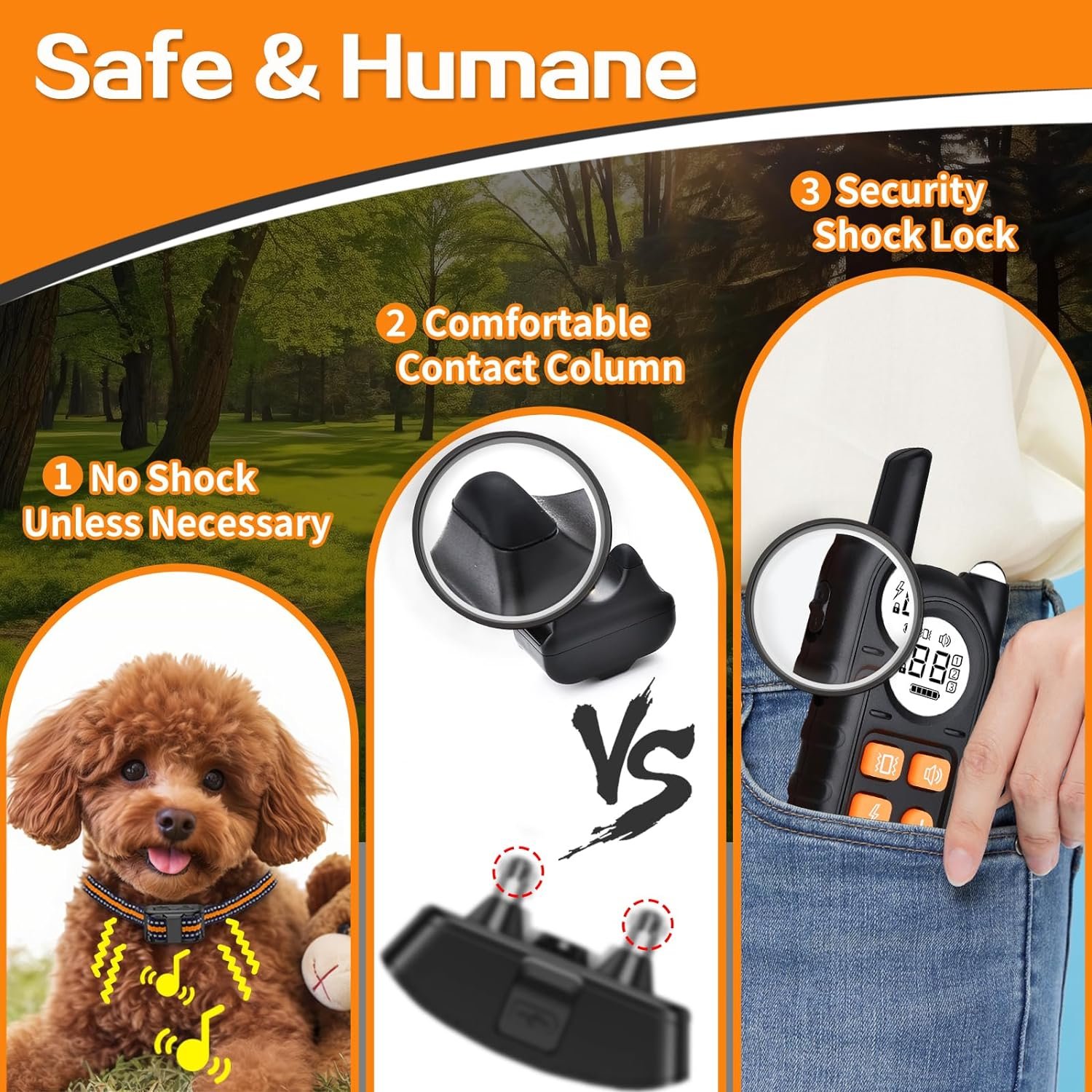🌟【Safety & Human-centric Features】: Prioritizes your dog’s well-being with a non-shock default setting, comfort contact points, and a safety lock for the shock feature.