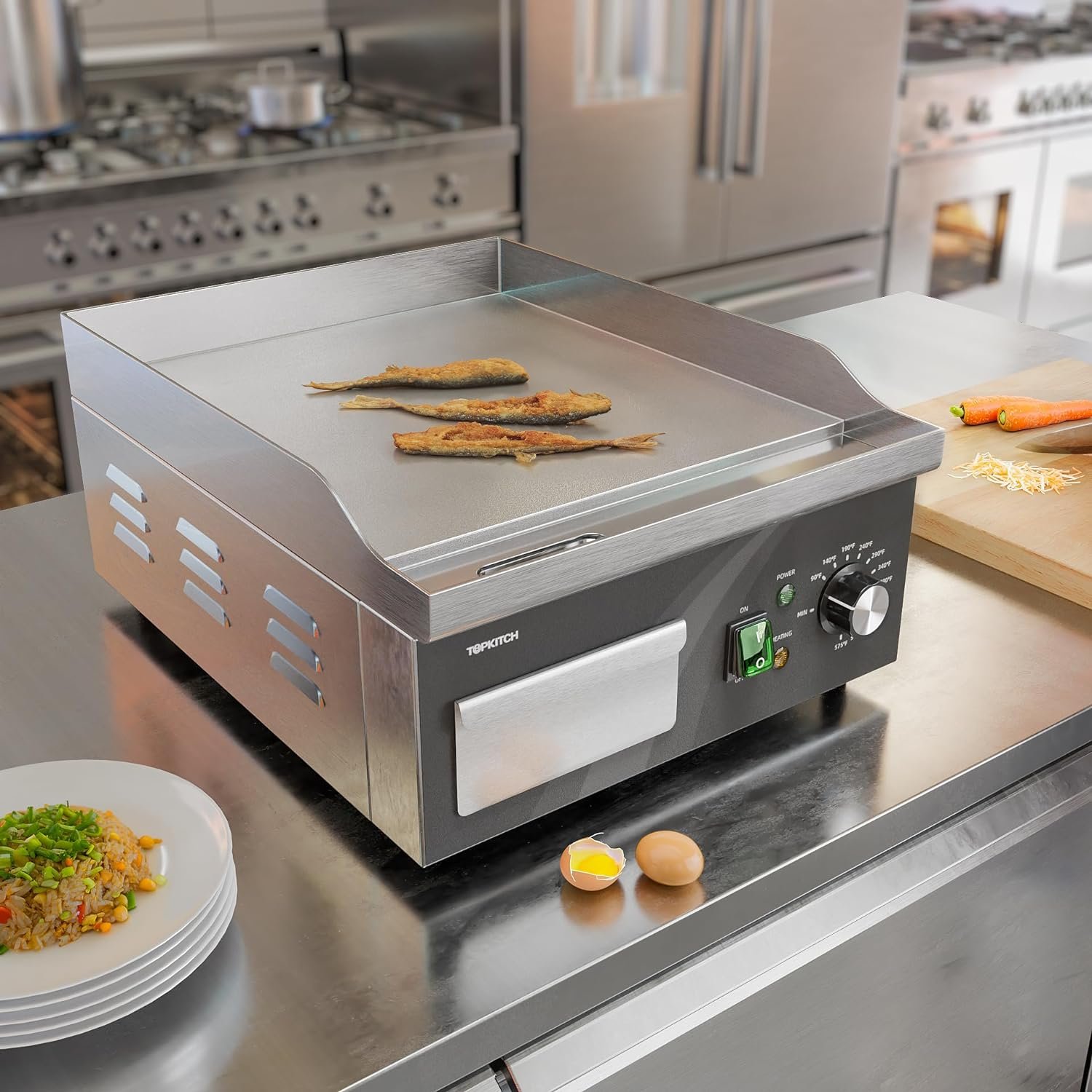 【Large cooking area】14 inch*17.5 inch large cooking area, thickened 8mm iron cooking plate makes the temperature across grill uniform. You can cook multiple dishes at the same time on this griddle to meet your fast and large demand. It is the best choice for commercial or home use