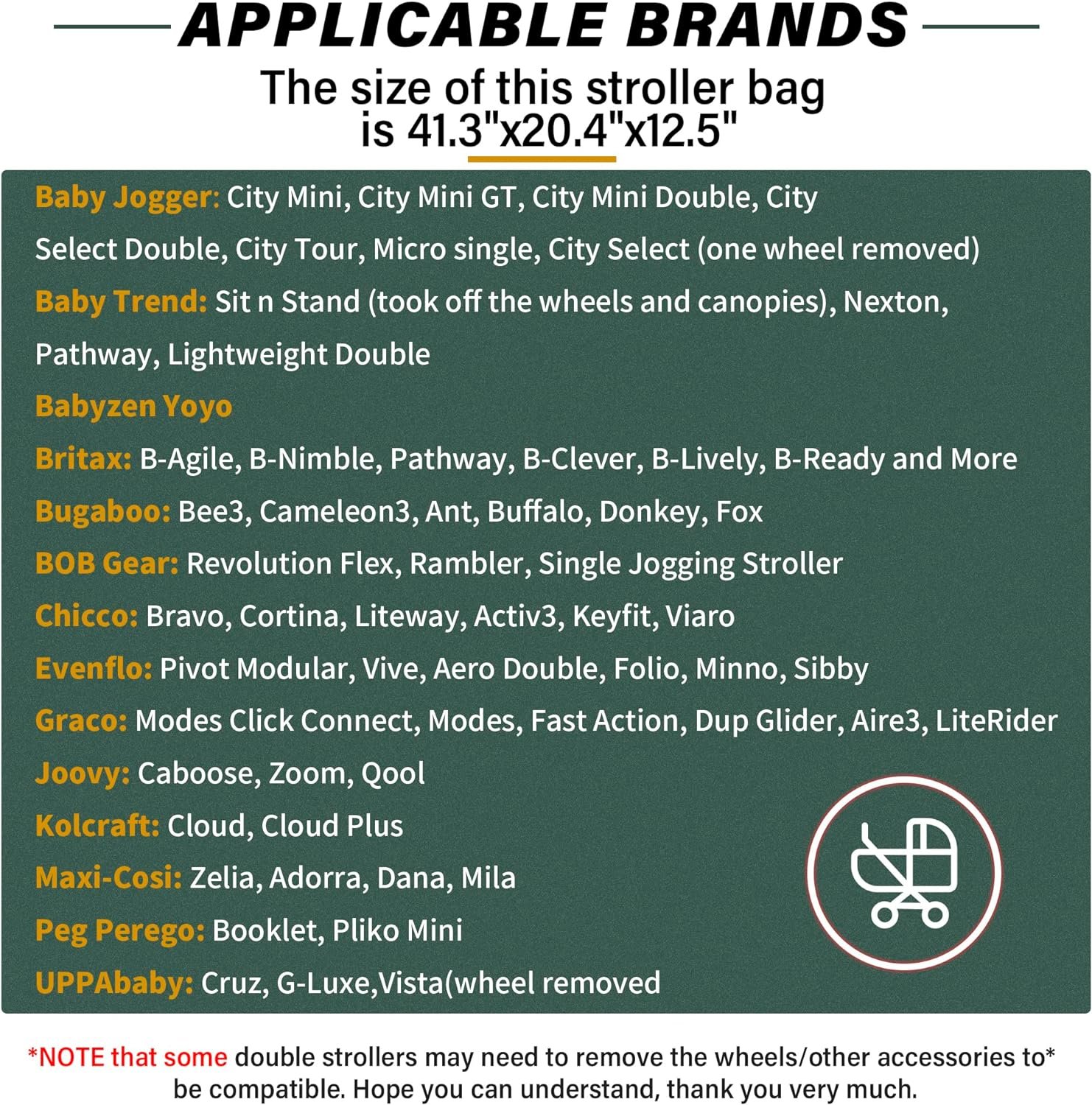 The size of this stroller bag is 41.3″x20.4″x12.5″, and it is compatible with most strollers, but note that some double strollers may need to remove the wheels/other accessories to be compatible. Hope you can understand, thank you very much.