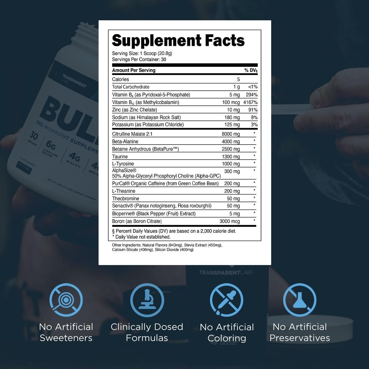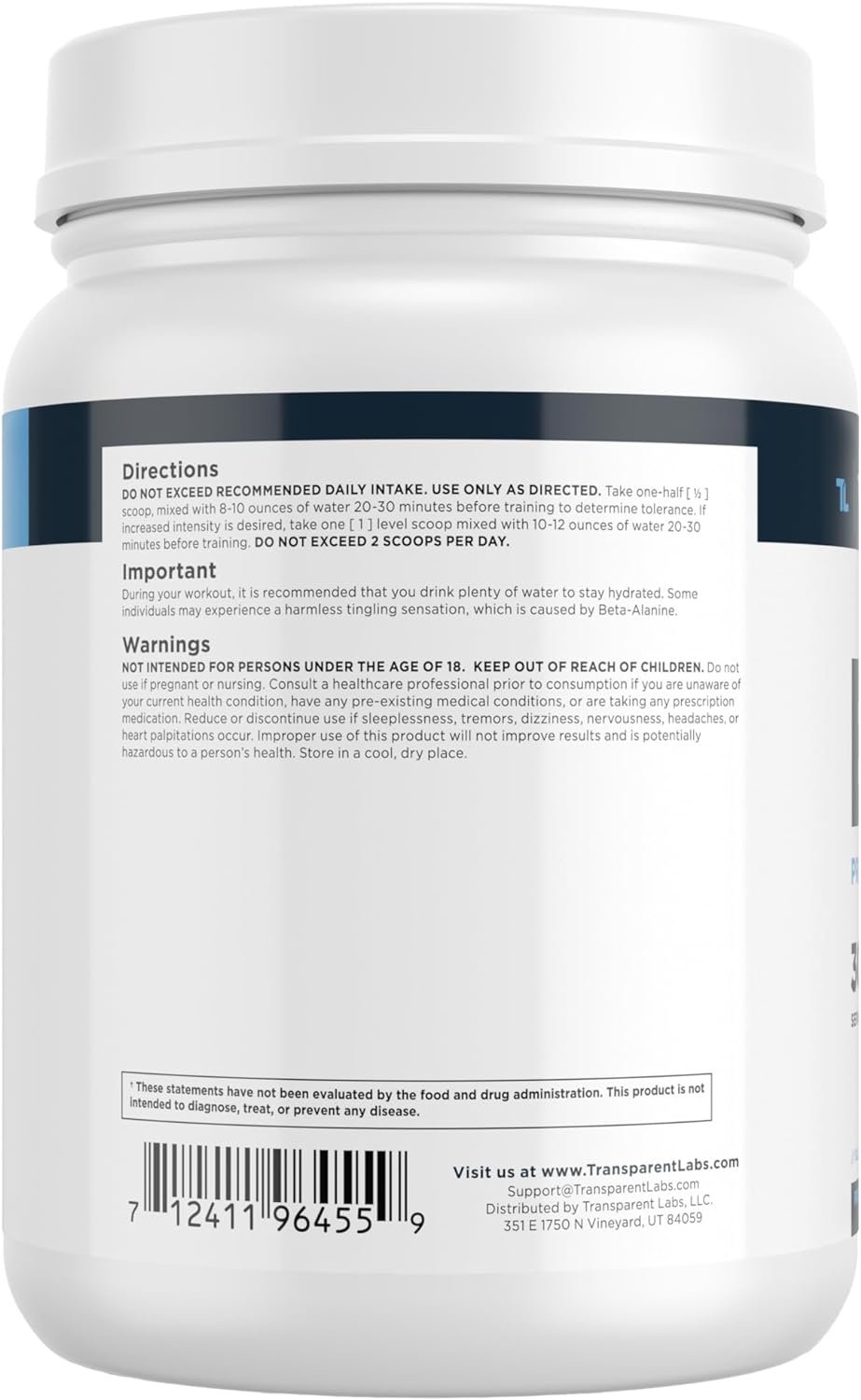Science-Backed Formula: Transparent Labs Bulk Pre-workout is distinguished by its extensive, evidence-based formula that includes key ingredients such as Citrulline Malate, Beta-Alanine, Betaine Anhydrous, Taurine, L-Tyrosine, AlphaSize Alpha-GPC, and more. This carefully crafted blend is designed to provide a holistic boost to your workout performance, ensuring you have the necessary tools to push your limits and achieve your fitness goals.