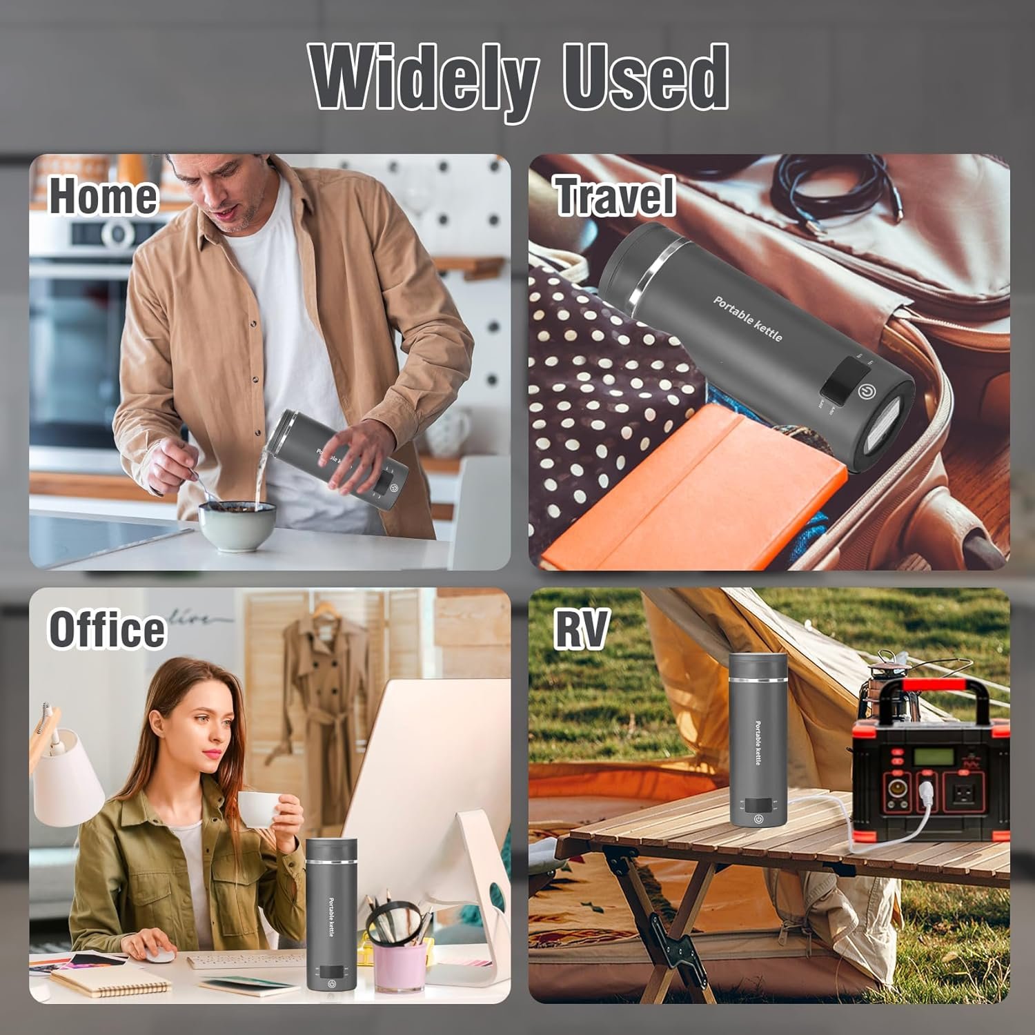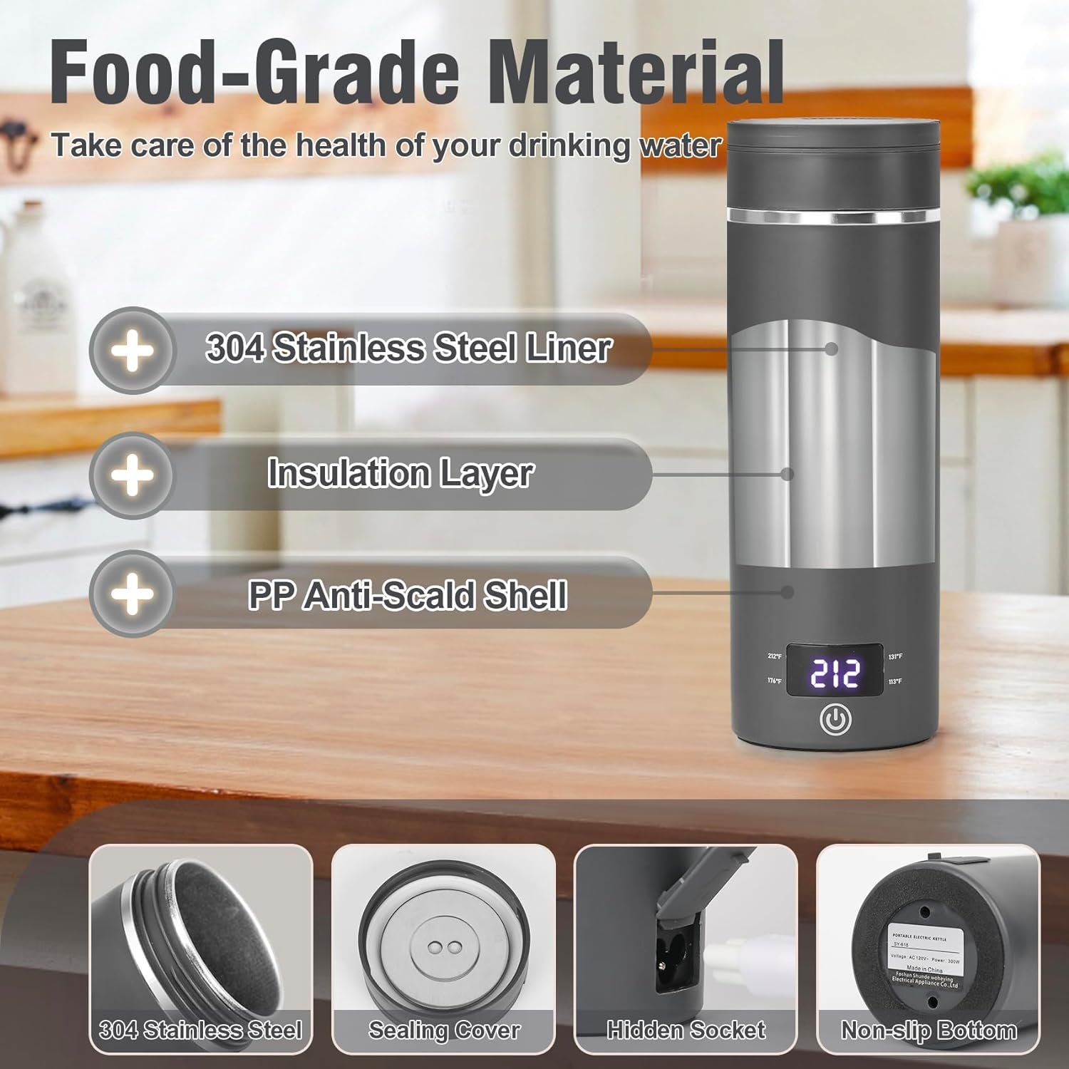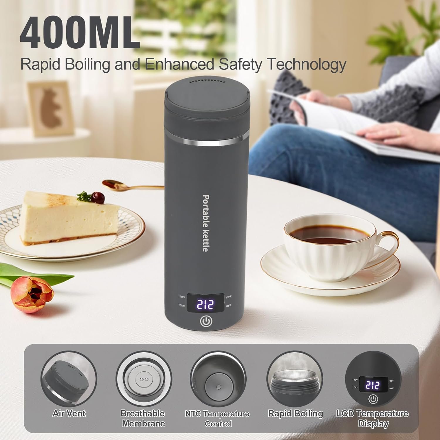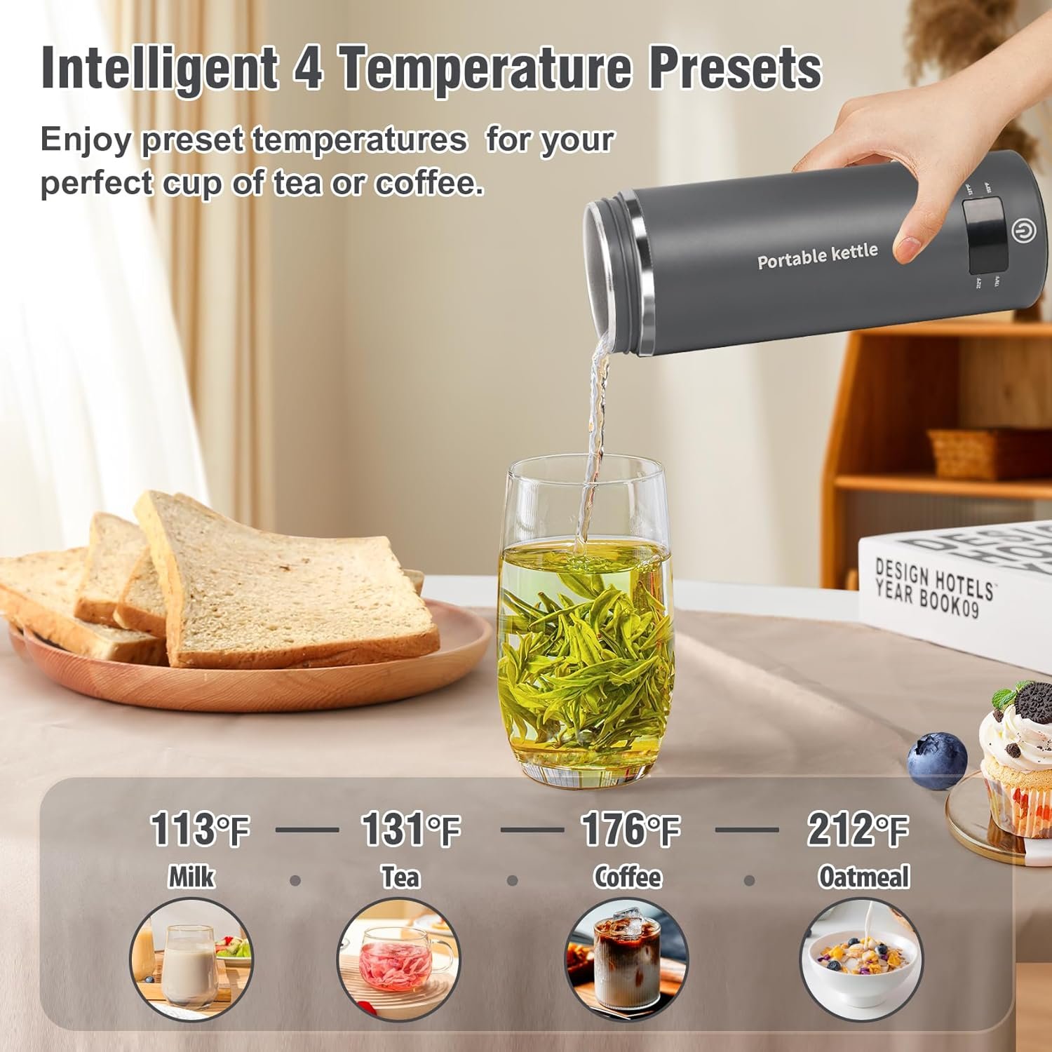 【4 Smart Temperature Presets】Portable electric kettle has 4 preset temperatures (212-176-131-113°F),through the LCD screen of the cup body to display the temperature easily switched. Travel water boiler can brew coffee, different kinds of tea, milk ,ect. Small kettle is not only a electric kettle, but also a water cup, can greatly improve the happiness of life.