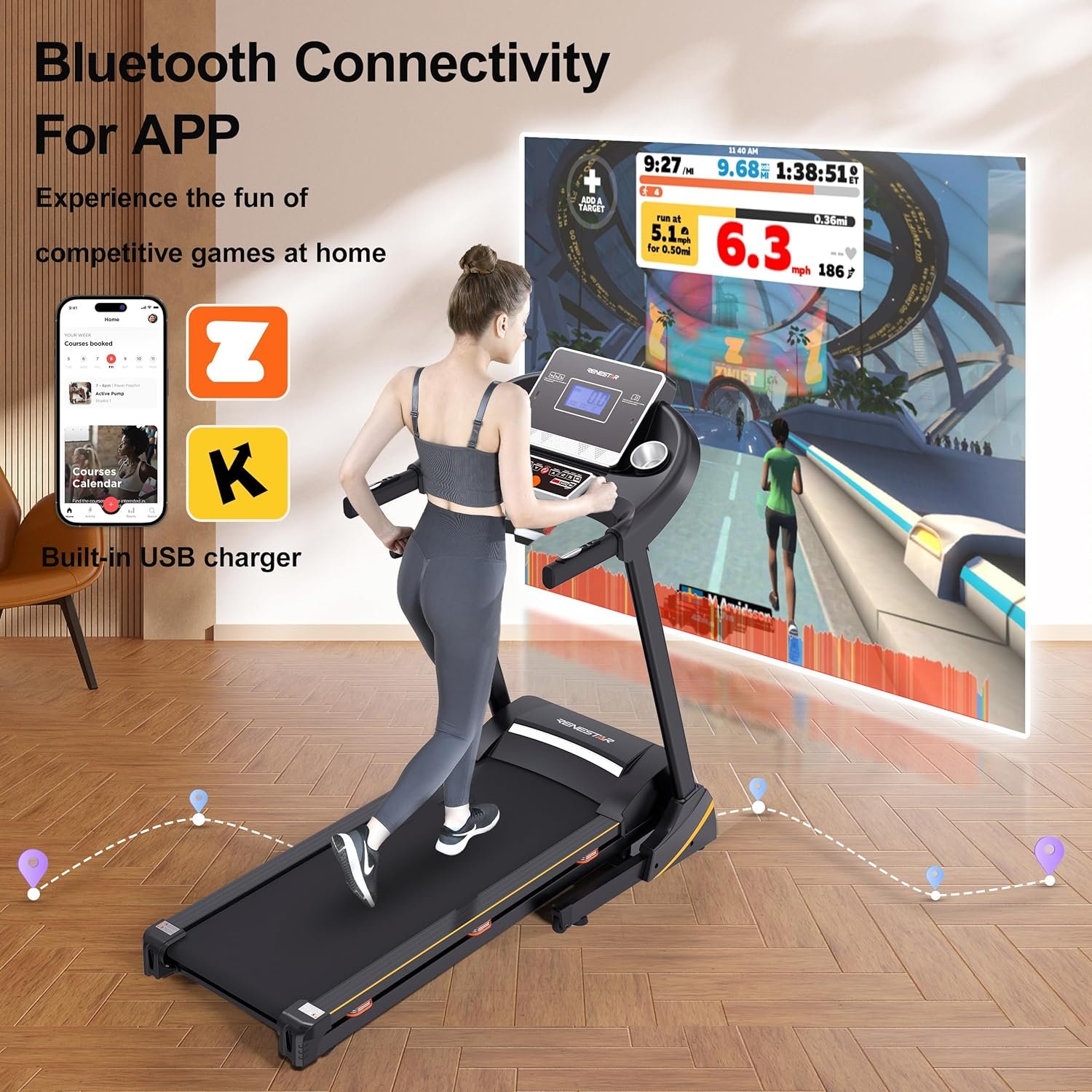 CLEAR & ACCURATE TRACKING: Stay connected and motivated during workouts with Bluetooth and app compatibility. The portable treadmill can monitor your heart rate with the built-in pulse sensors, and track essential workout metrics including speed, incline, time, distance, calories burned, and heart rate displaying simultaneously on the clearly comprehensive LCD large screen. Stay motivated and informed throughout your workout with the treadmill’s advanced tracking capabilities.