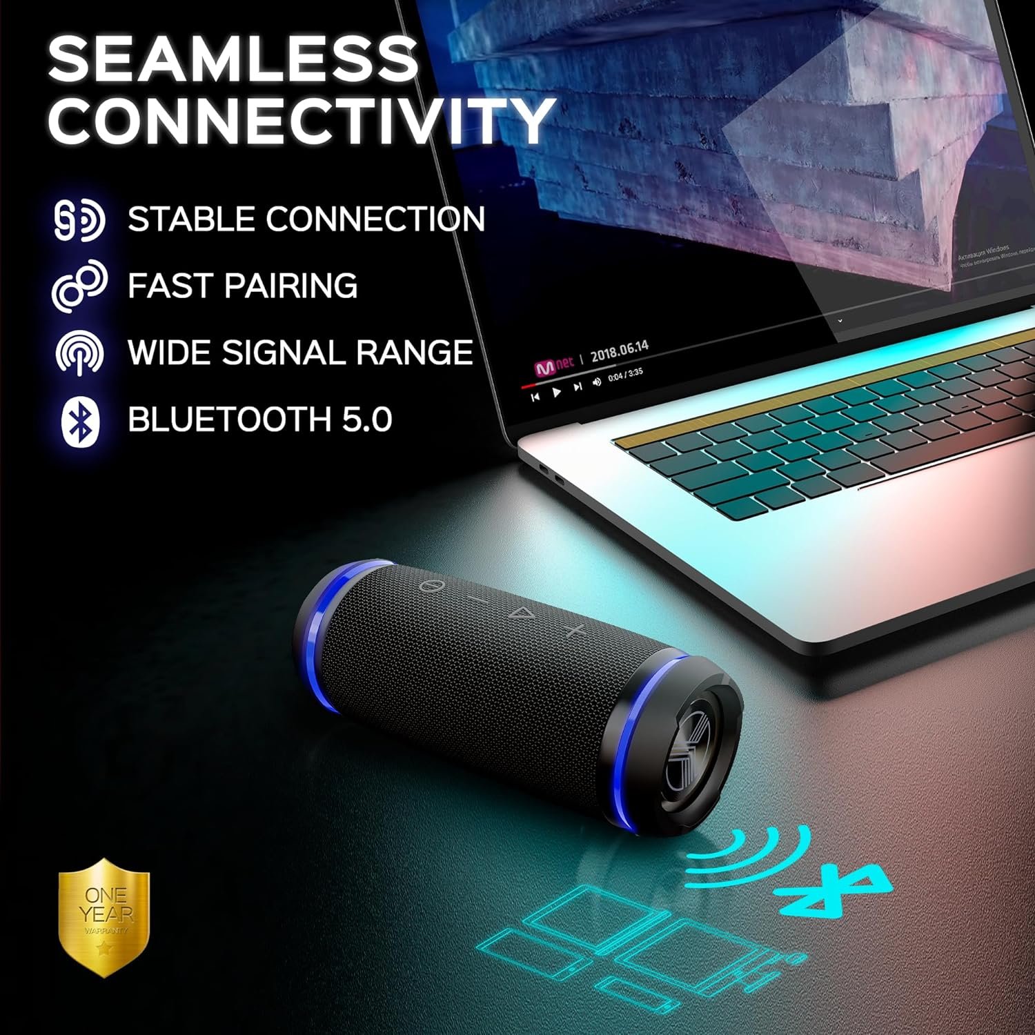 Additional Features – Add flair to your wireless outdoor speaker with an ambient LED light mode. Enjoy convenient control buttons for a hassle-free experience. Enhance your audio experience with bluetooth party speaker with bass for indoor or outdoor fun. 1-Year Warranty.