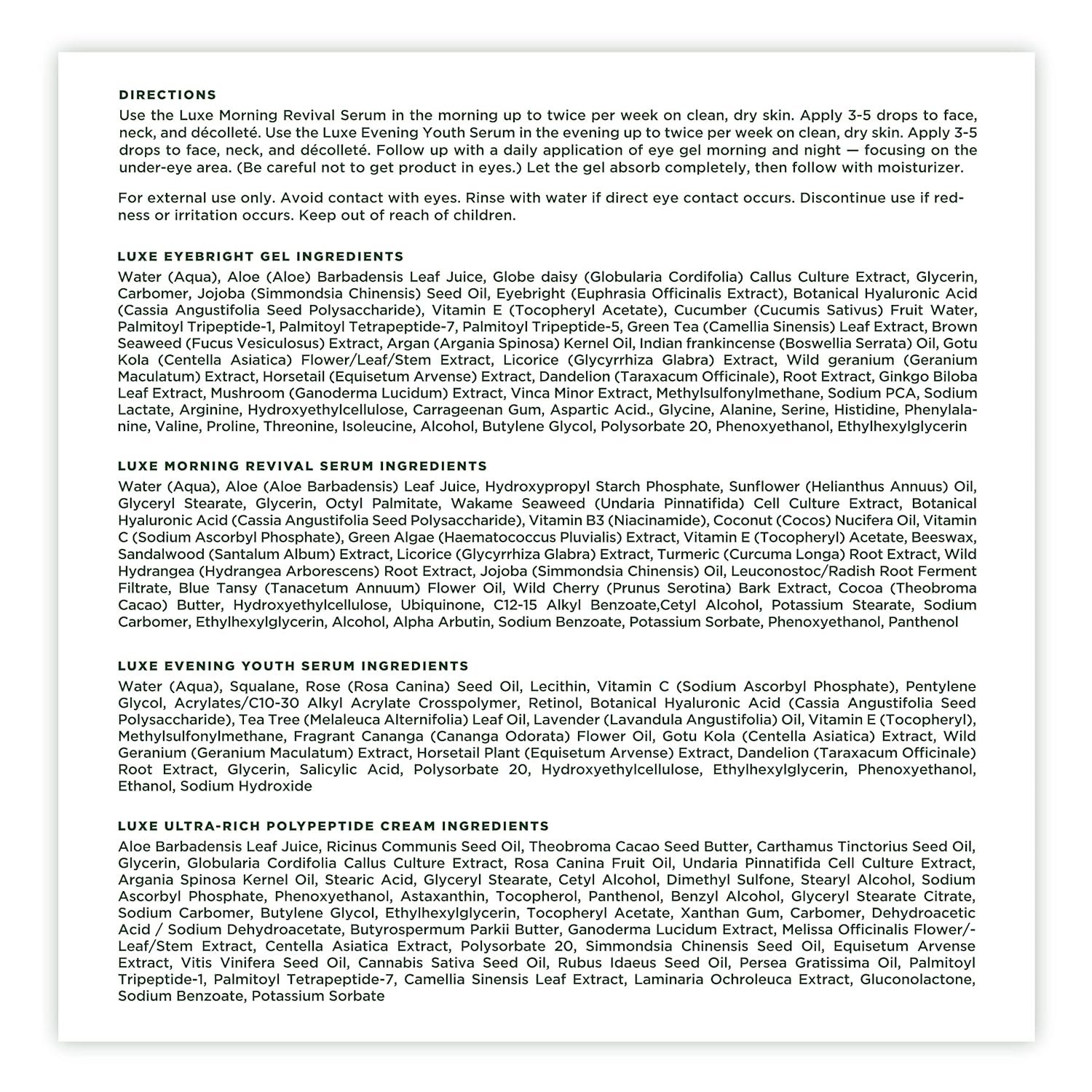 Directions: Use the Luxe Morning Revival Serum in the morning up to twice per week on clean, dry skin. Apply 3-5 drops to face, neck, and décolleté. Use the Luxe Evening Youth Serum in the evening up to twice per week on clean, dry skin. Apply 3-5 drops to face, neck, and décolleté. Follow up with a daily application of eye gel morning and night — focusing on the under-eye area. (Be careful not to get product in eyes.) Let the gel absorb completely, then follow with moisturizer.