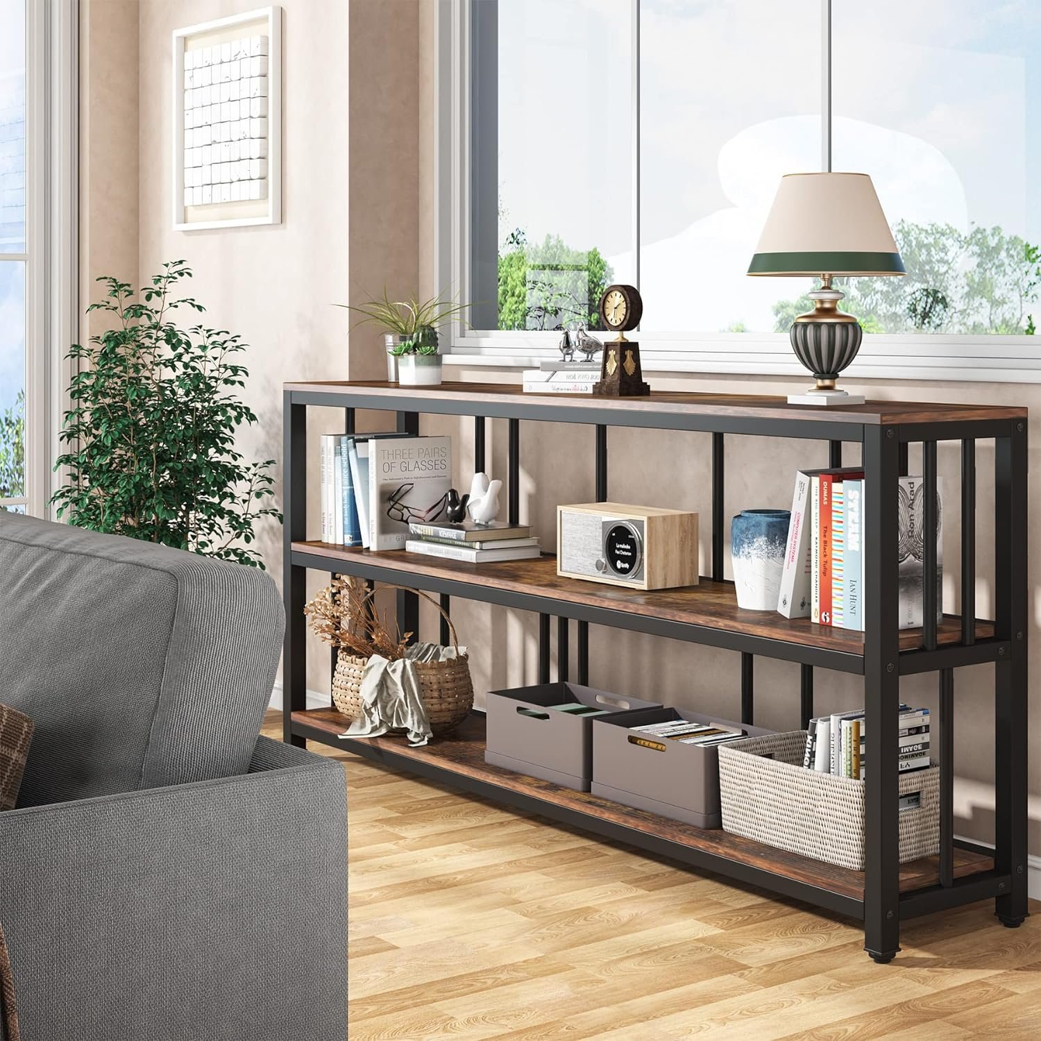 3 Tiers Long Console Table: There are 3 tiers of shelves on the sofa table, adding the extra storage space to the sofa table and helping you keep your room tidy. Each shelf is L70.86 inches * W11.81 inches. It can organize your room with its large storage space.