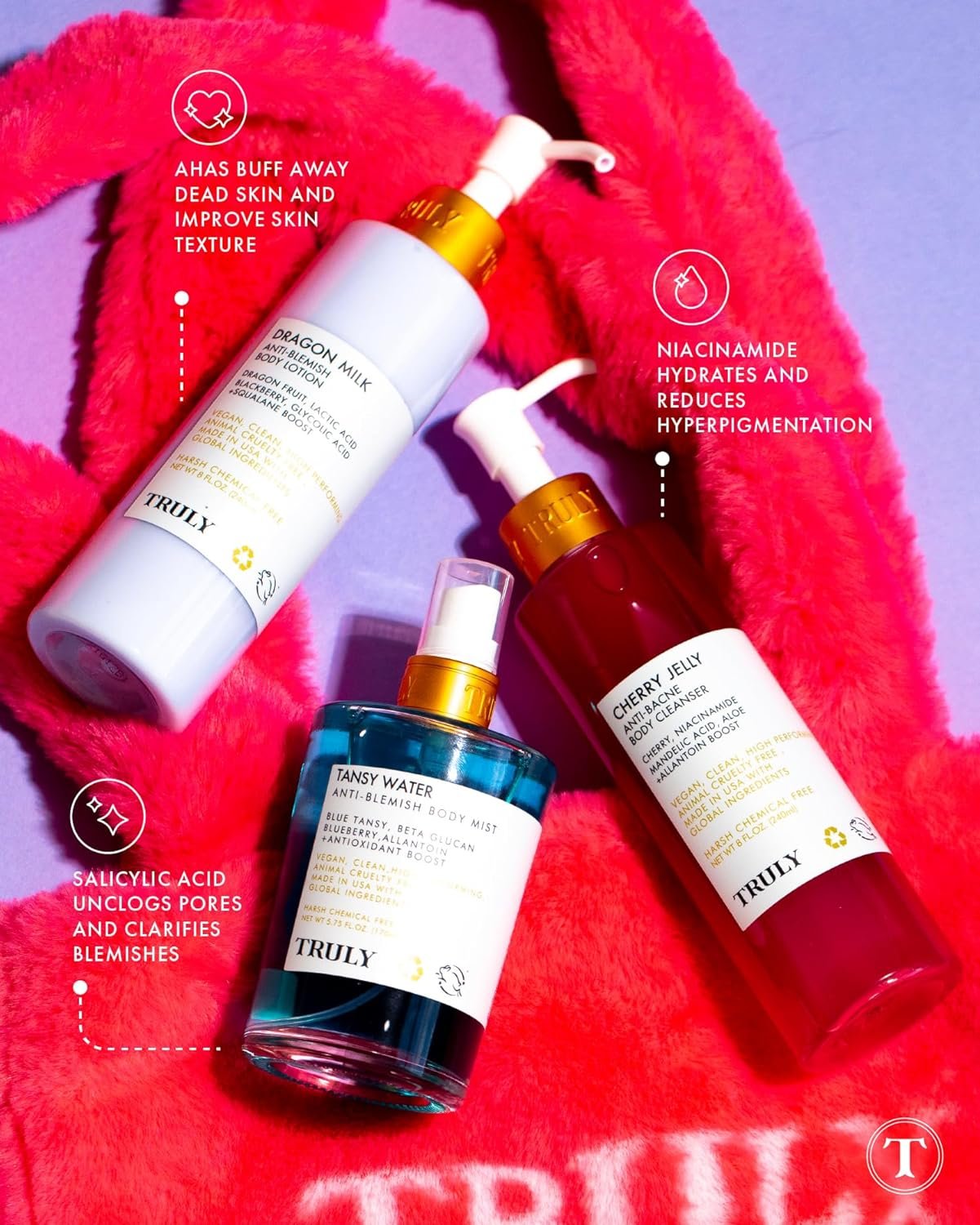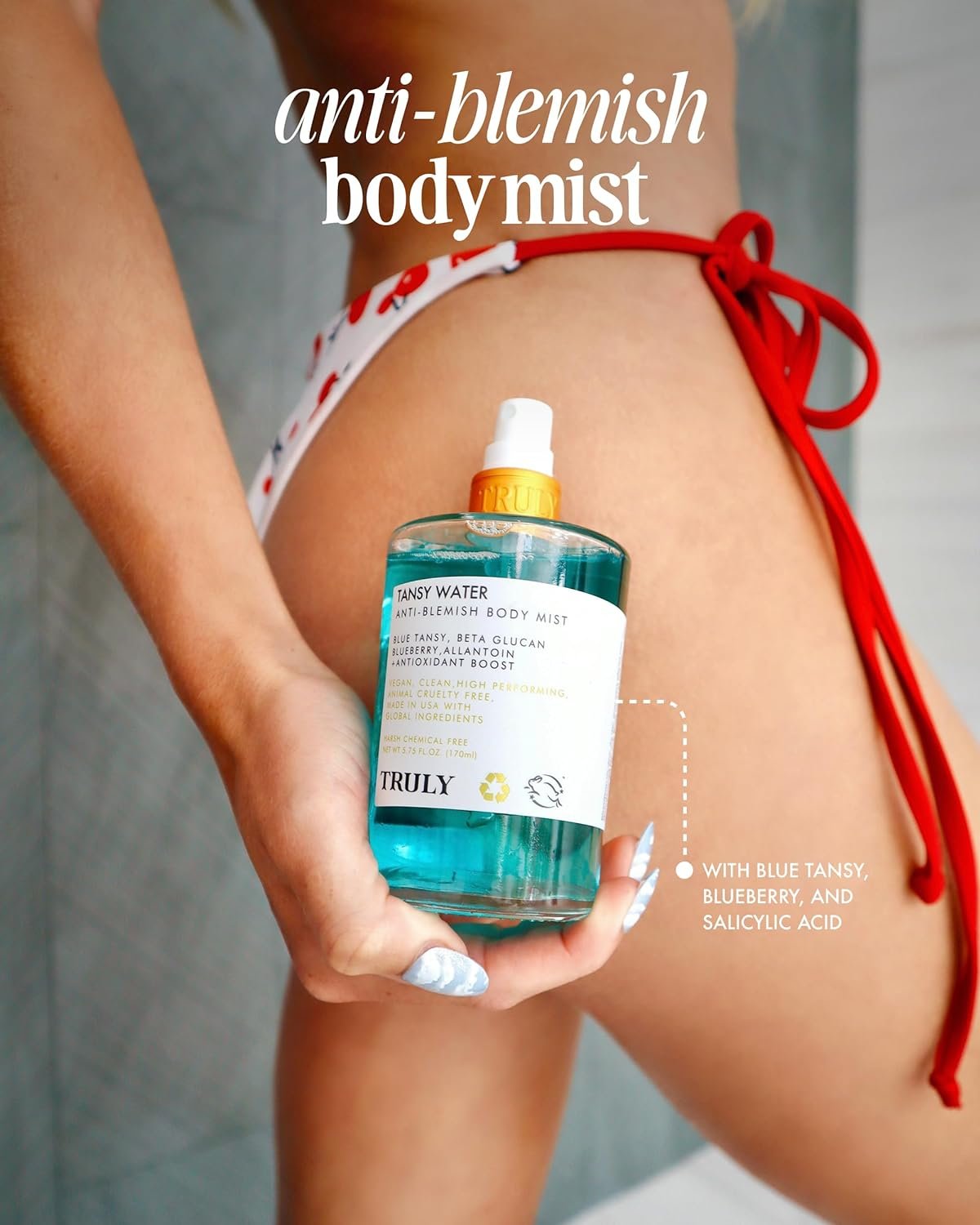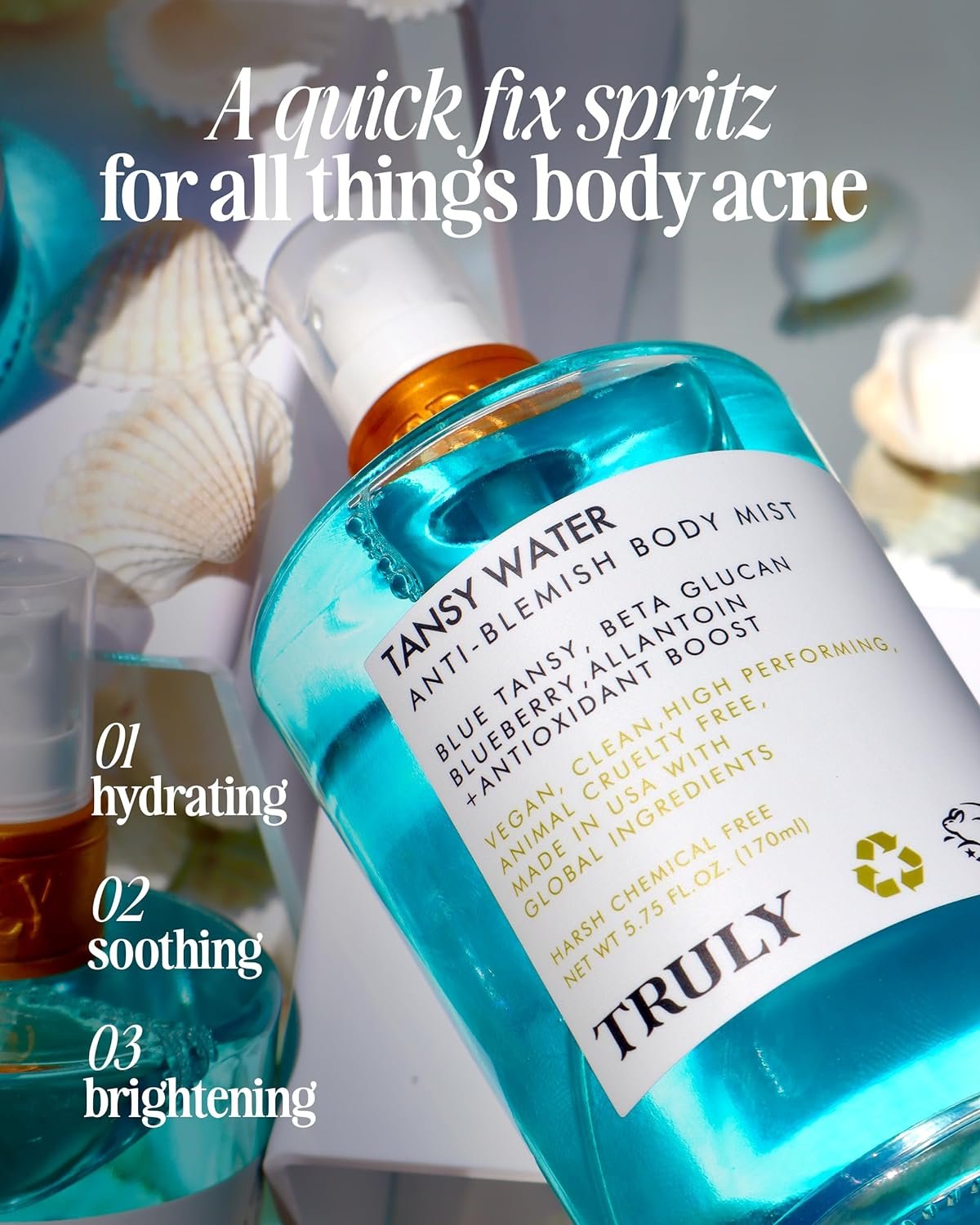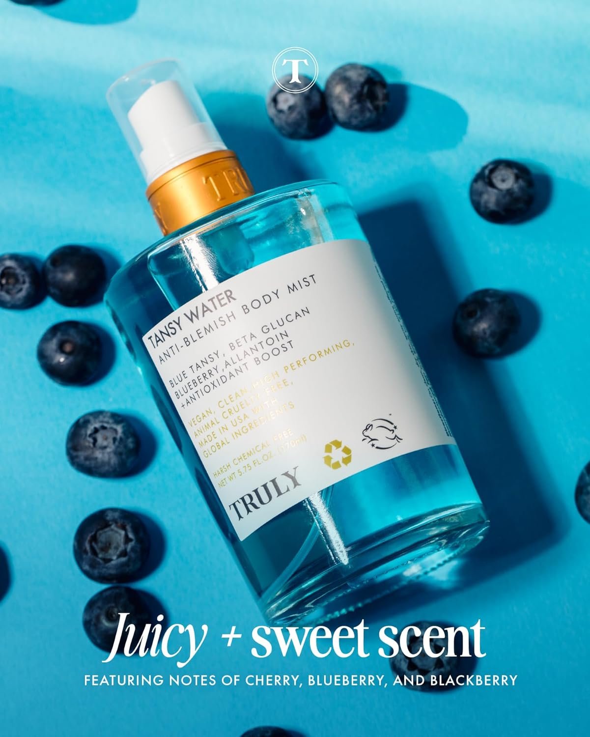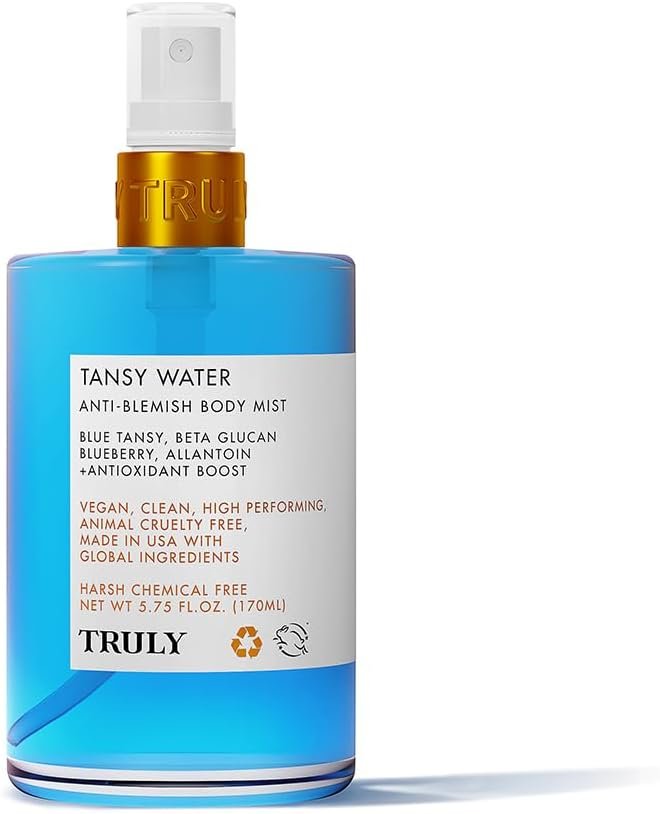 Tansy Water is a quick fix spritz for all things body acne. A blend of blue tansy, blueberry, and salicylic acid assist the body in fighting swellness while promoting a nourished, brightened, and even complexion.