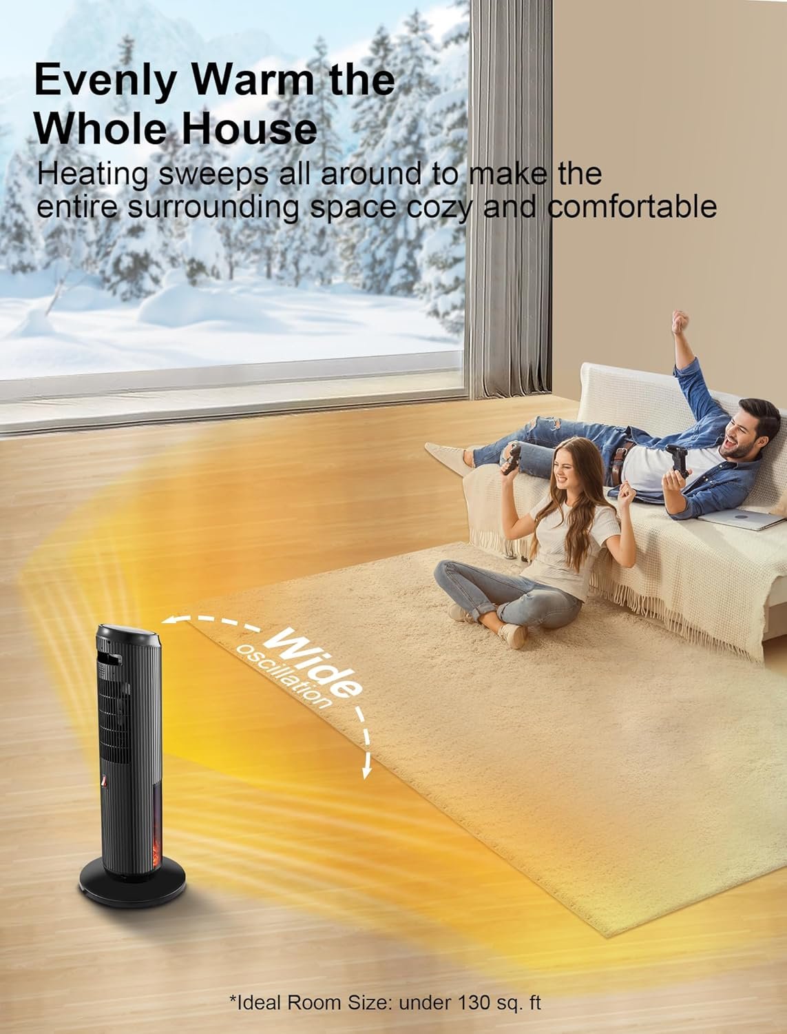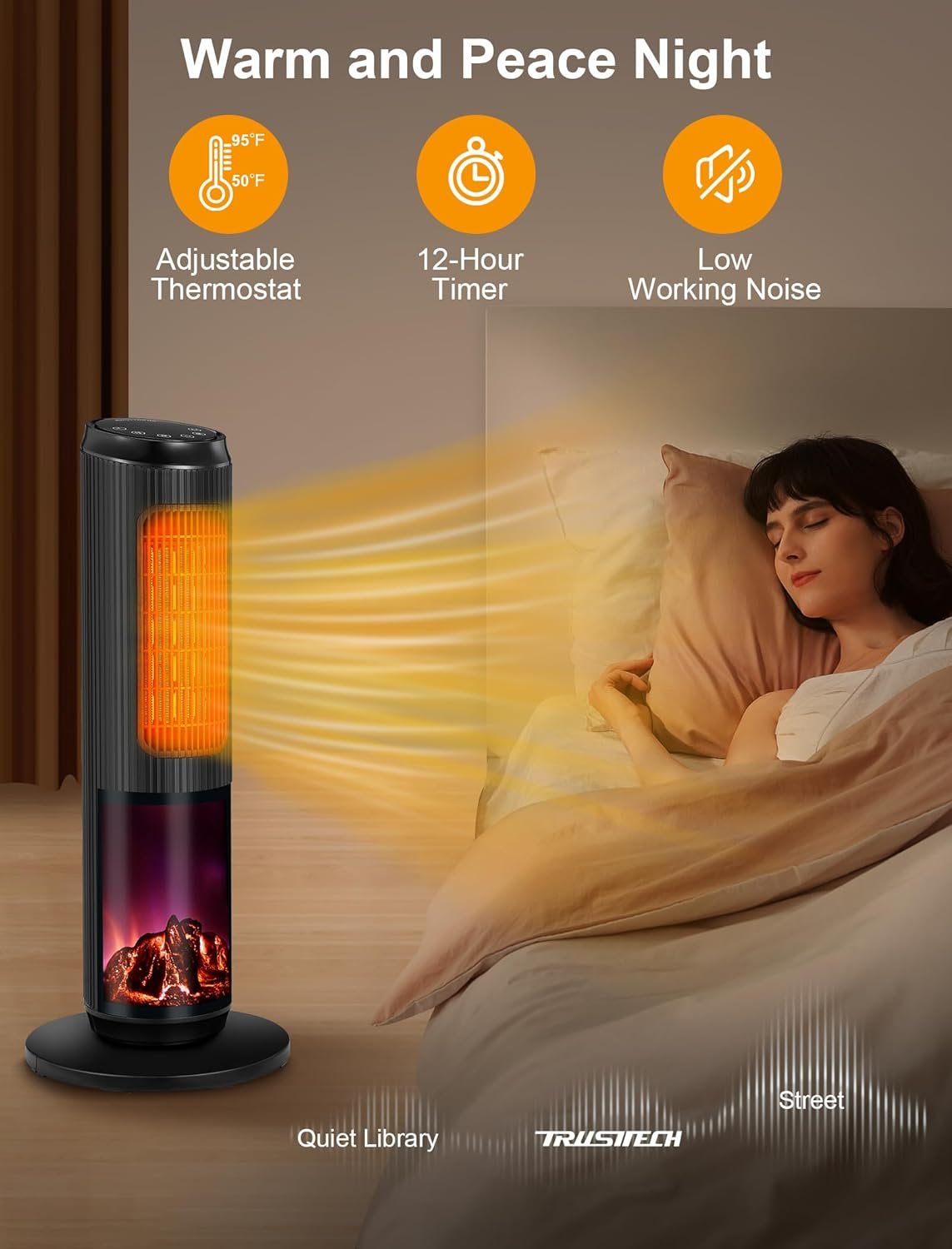 [Inviting 3D Flame Effect for Cozy Nights] Elevate your ambiance with the stylish 3D flame effect of the TRUSTECH space heater. It doubles as a captivating night light, infusing your home with a cozy winter glow. Moreover, the heater boasts a 1-12 hour timer, granting you the luxury of uninterrupted sleep on frosty evenings without worrying about manually turning off the tower heater.