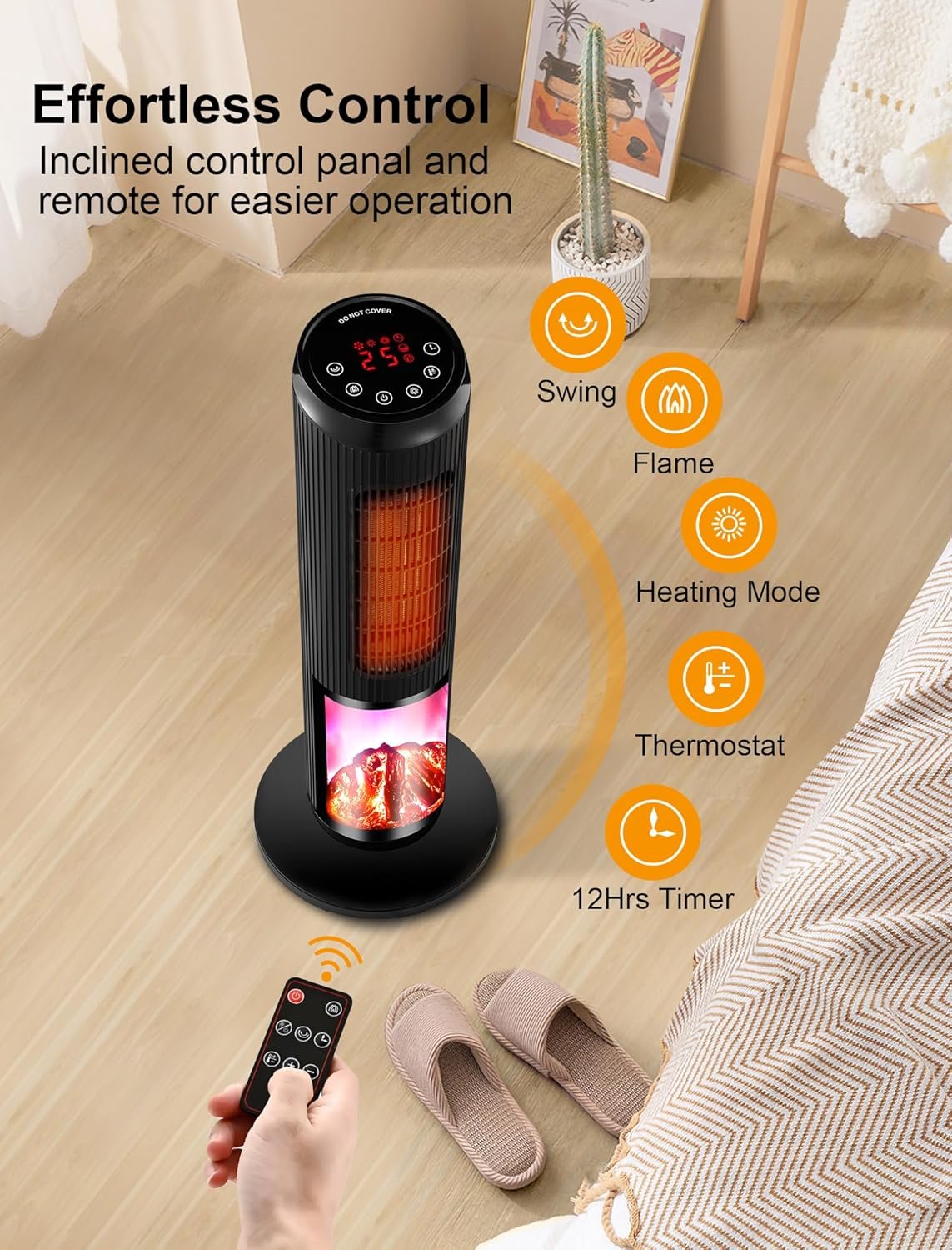 [Control Made Easy] Featuring an intuitively slanted digital panel and convenient remote control, this electric space heater offers simplified operation. Adjust settings effortlessly with a single touch or remote control while you work or lounge on the sofa. Enhanced mobility is facilitated by integrated handles, allowing you to relocate the portable heater with ease.