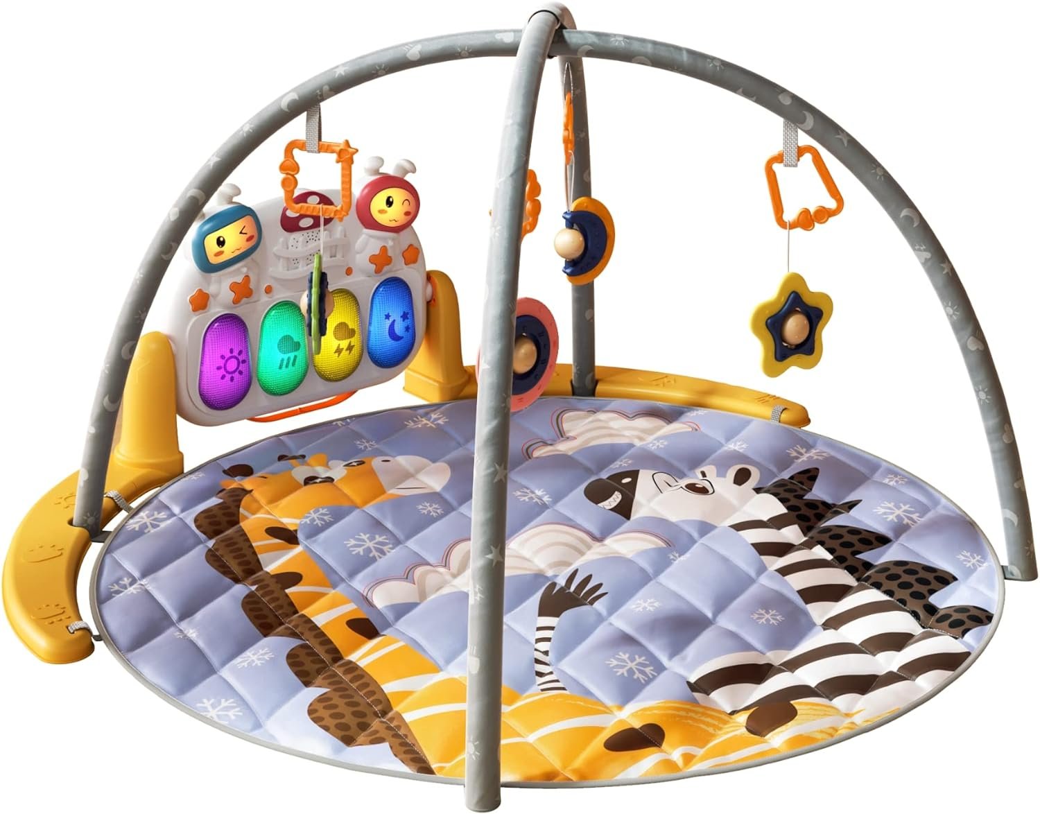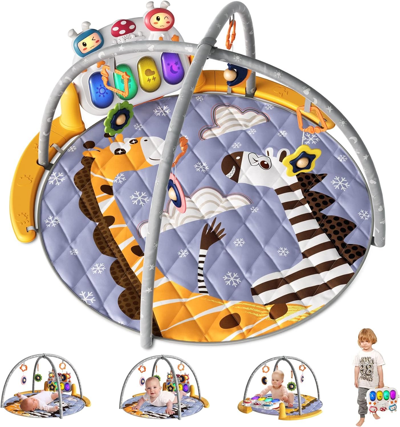 Easy to Install and Remove: No tools required, 5 minutes to complete the installation. The overhead arche can be removed from the play mat, and the baby rattle can be easily removed and replaced with other toys your baby likes. The piano can be removed and installed elsewhere. The play mat can also be folded up, making them ideal for carrying around while traveling.