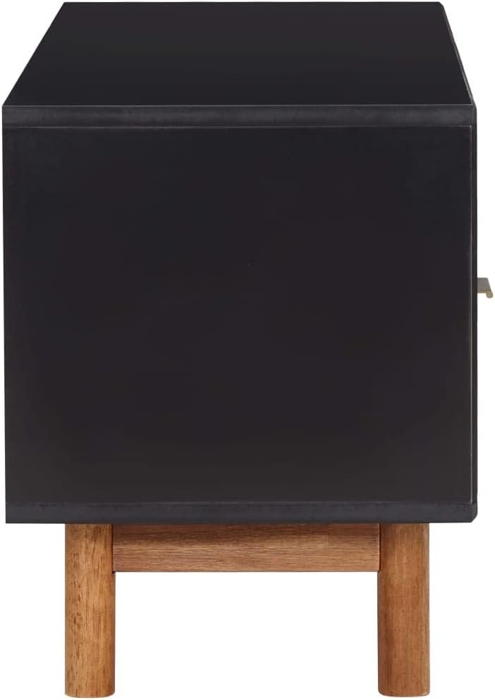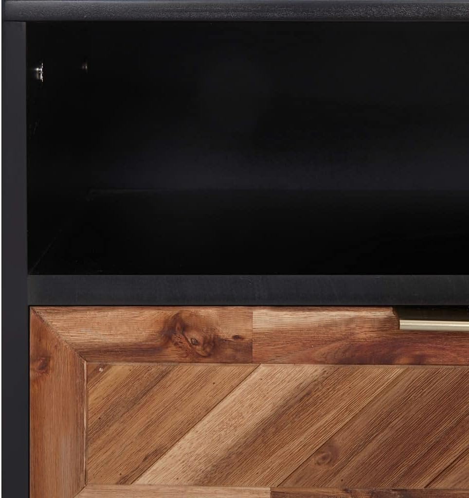Color: Matt black and dark brown. Material: Solid acacia wood with a natural finish, MDF, aluminum. Dimensions: 39.4″ x 13.8″ x 17.7″ (W x D x H). Leg diameter: 1.6″. With 2 drawers and 1 shelf. Features gold aluminum handles. Assembly required: Yes.