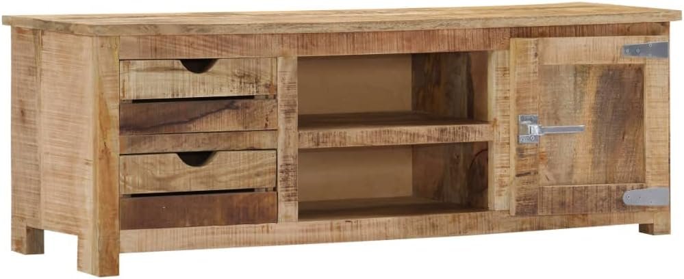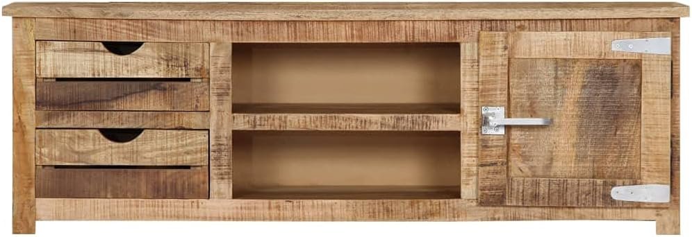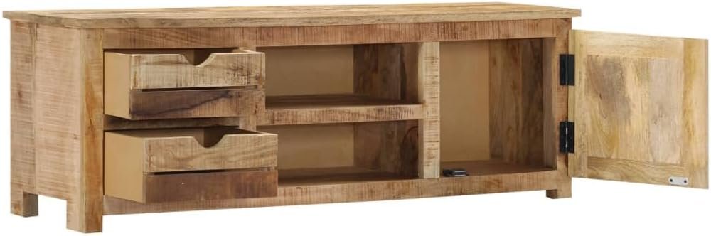 The sideboard is made of solid mango wood, a hardwood with dense grains. Rough mango wood not only has the strength to bear the weight, but also stands the wear and tear of time. Therefore this beautifully-designed lowboard is exceedingly stable, durable and captivating. Additionally, this stereo cabinet is fully handmade and the aesthetically-appealing wood grains make every piece of furniture distinctive and slightly different from each other. This HiFi cabinet features 2 drawers, 2 compartments and 1 cabinet with door, providing ample space for storing your multimedia appliances, books, shoes, as well as various other items.