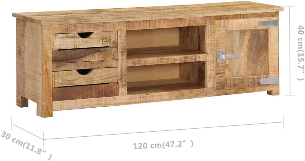 Material: Solid mango wood, engineered wood. Dimensions: 47.2″ x 11.8″ x 15.7″ (W x D x H). Finish: Polished and lacquered. With 2 drawers, 2 compartments and 1 cabinet with door.