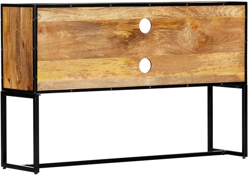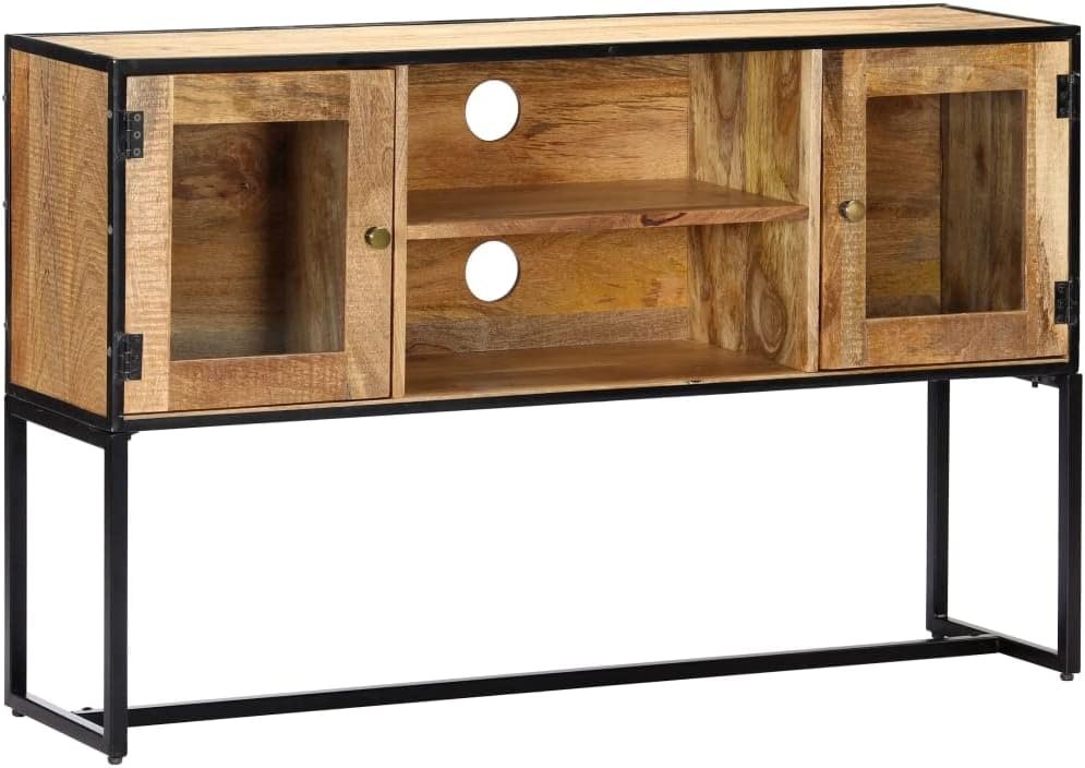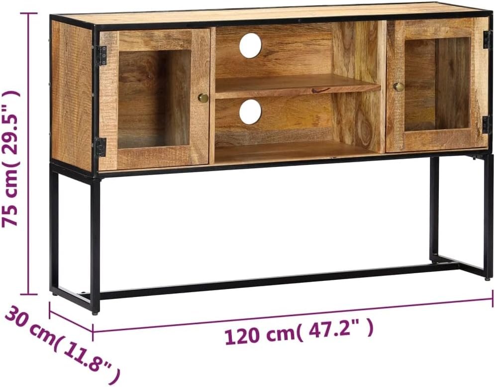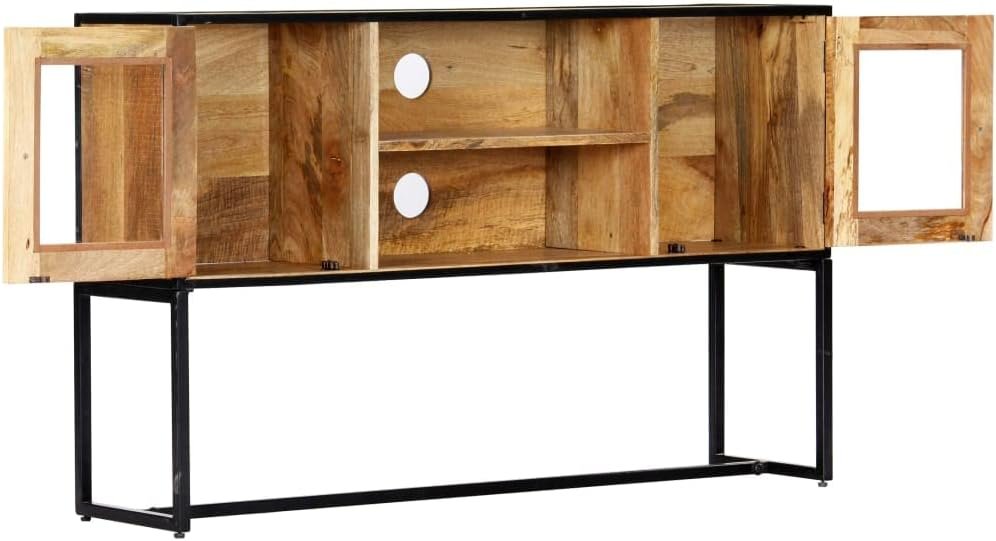 Material: Solid reclaimed wood + powder-coated steel. Dimensions: 47.2″ x 11.8″ x 29.5″ (W x D x H). Finish: Polished, painted and lacquered. With 2 doors and 2 open compartments. No assembly required.