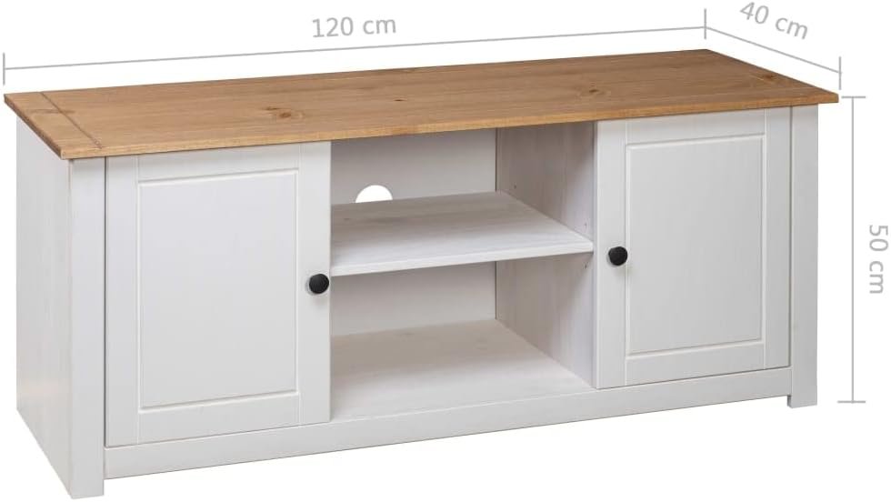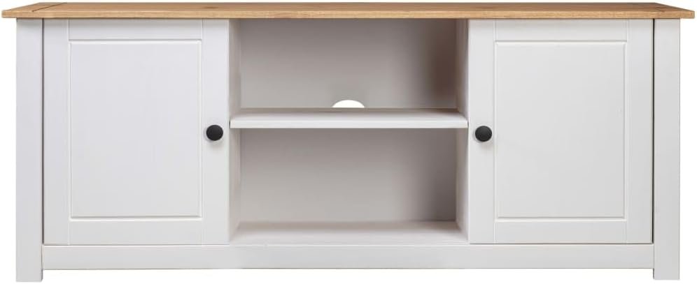 Color: White and natural wood color. Material: Solid pine wood. Dimensions: 47.2″ x 15.7″ x 19.7″ (W x D x H). With 2 doors and 2 compartments.
