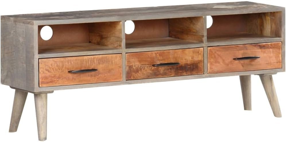 Stylish and Durable:This TV stand is crafted from solid mango wood, a tropical hardwood renowned for its strength and durability. The distressed finish and beautiful wood grains add a touch of rustic charm to your living space.