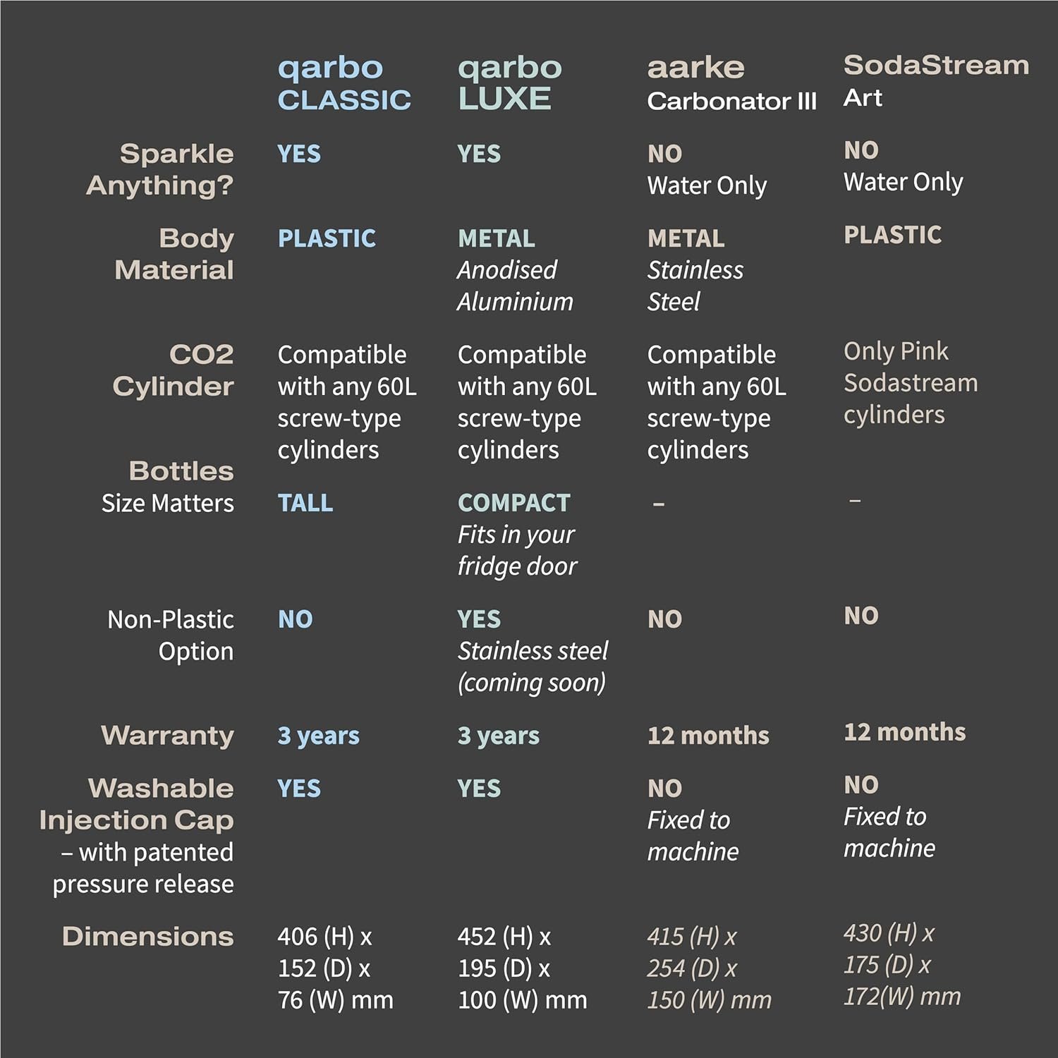 🇮🇹 Italian Design & Superior Durability: Experience luxury with the qarbo LUXE’s robust anodised aluminium body available in Tuscan Gold, Amalfi Silver, and Vesuvius Black. This sparkling water maker is not only stylish but also built to last.