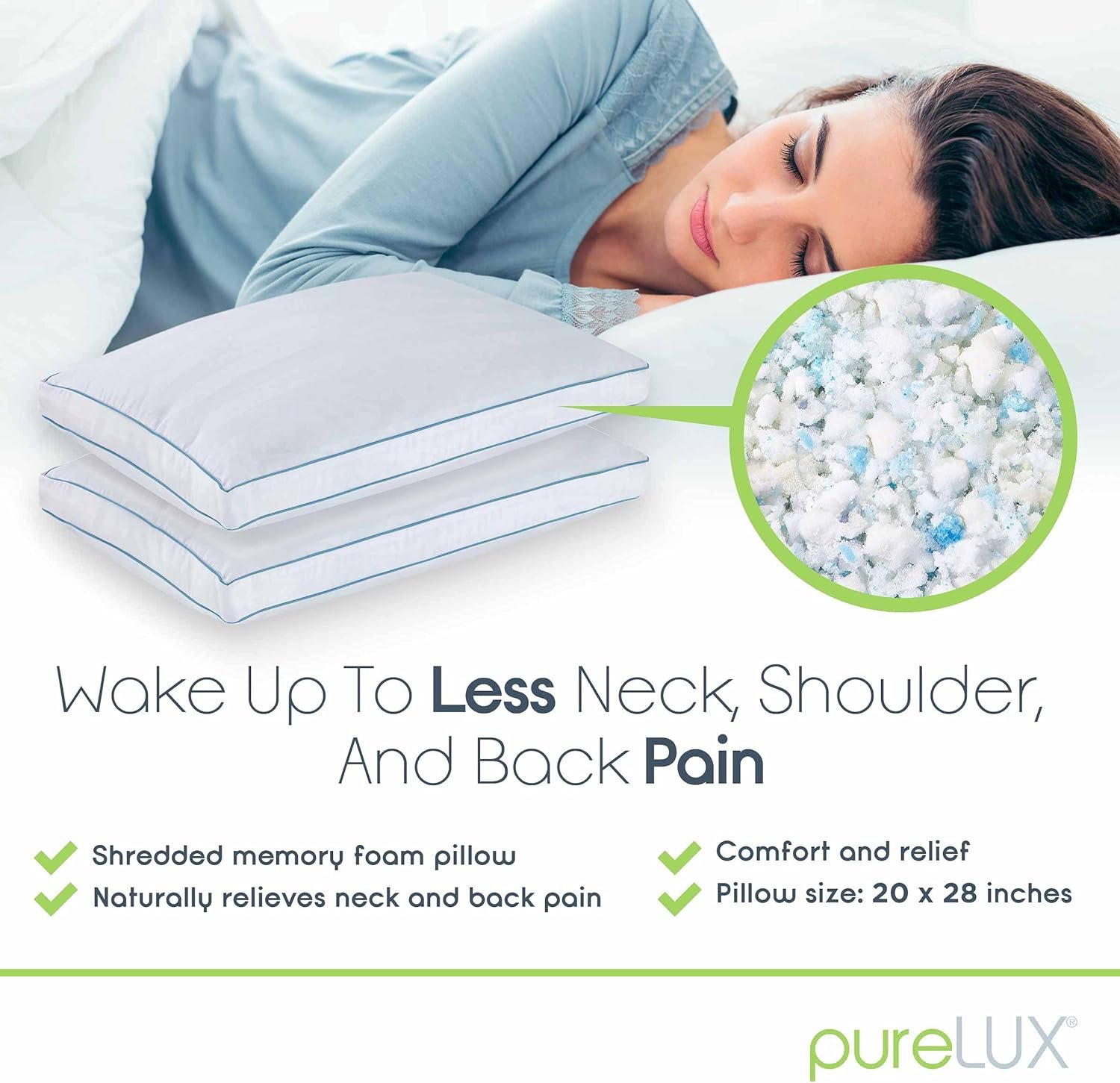 FEEL THE PERFECT FOAM COMBINATION – PureLUX shredded foam pillow cluster is made of 70% memory foam and 30% conventional foam. This memory foam combination feels firm compared to down pillows, and helps provide lasting pressure relief and comfort. For best results, fluff up before use.