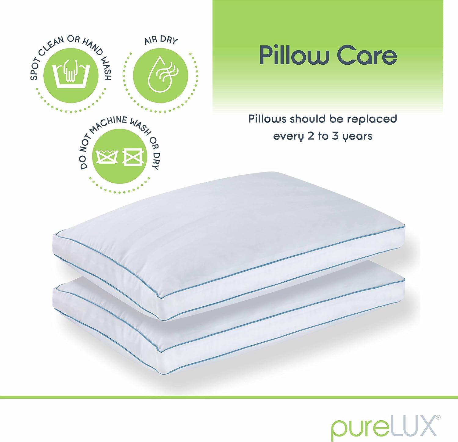 PILLOW CARE – CertiPUR US and OETX-TEX100 certified. All product materials are carefully selected, inspected, and well constructed to ensure that the bed pillows will hold up to daily use. Hand wash these pillows every 2 months, or spot clean them whenever necessary. Never put these memory foam pillows in the washing machine or dryer to avoid damage. Memory foam pillows should be replaced every 2 to 3 years.