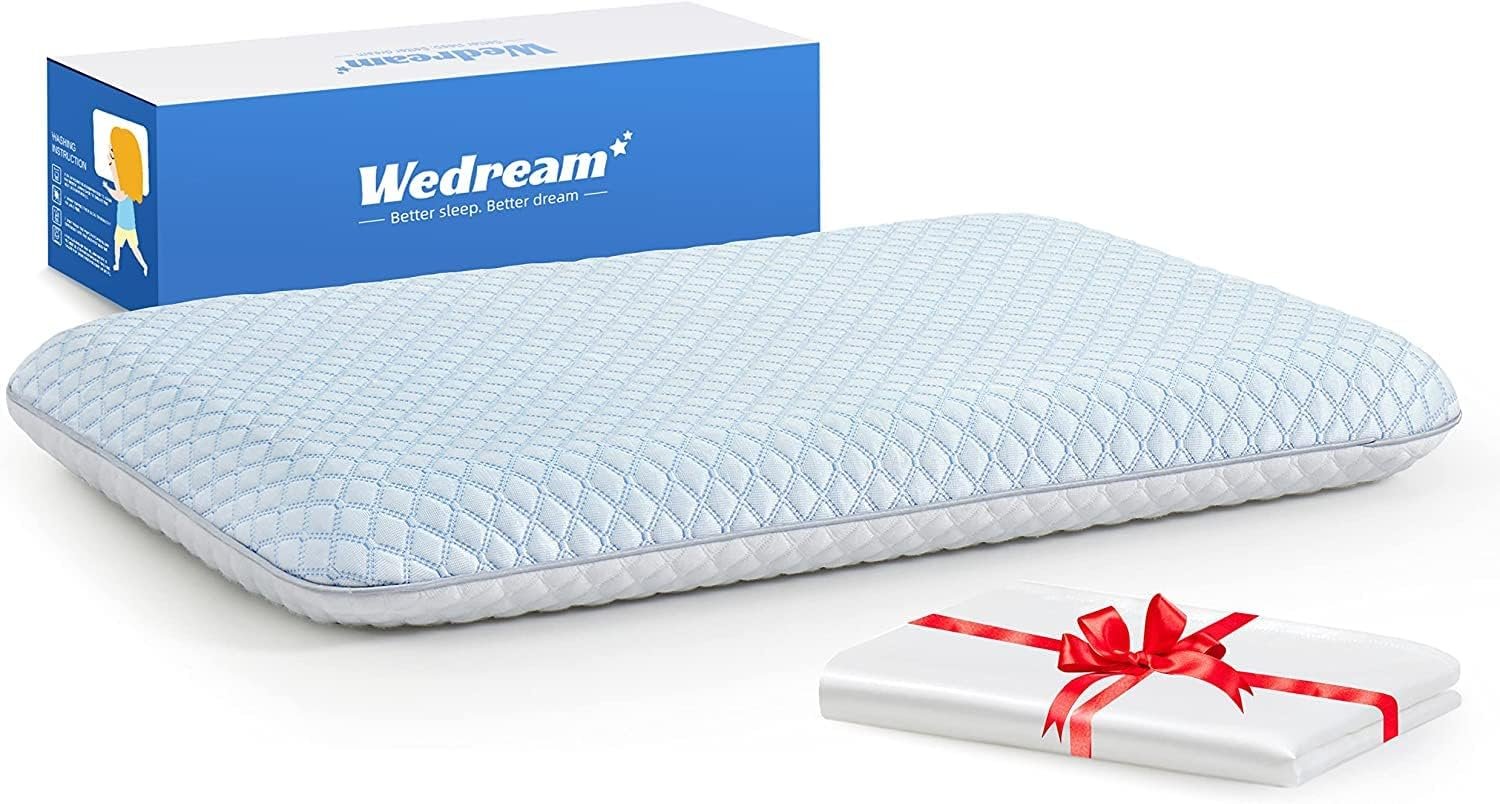 Gel Thin Mermory Foam Pillow for Stomach and Back Sleepers,Slim and Flat Design for Spinal Alignment Reversible Ice Silk Cooling Cover