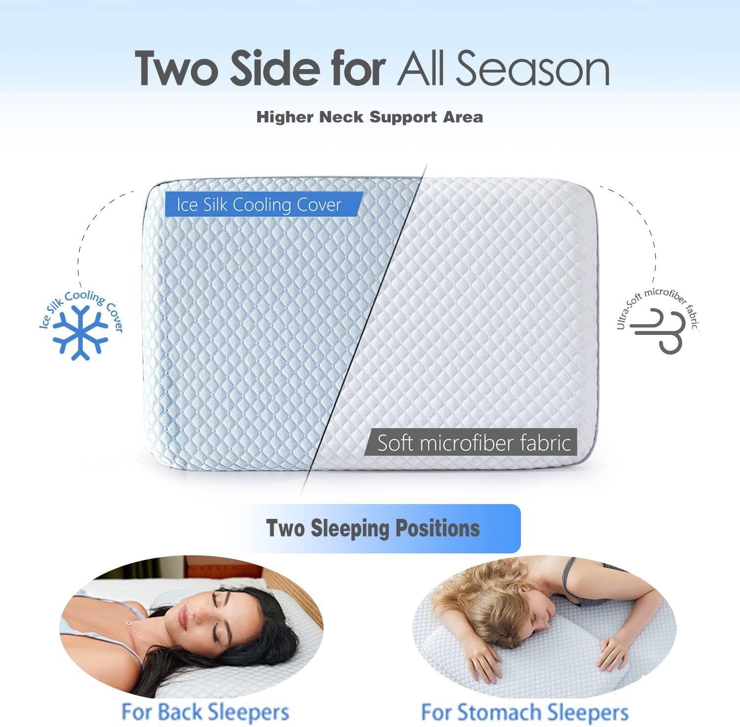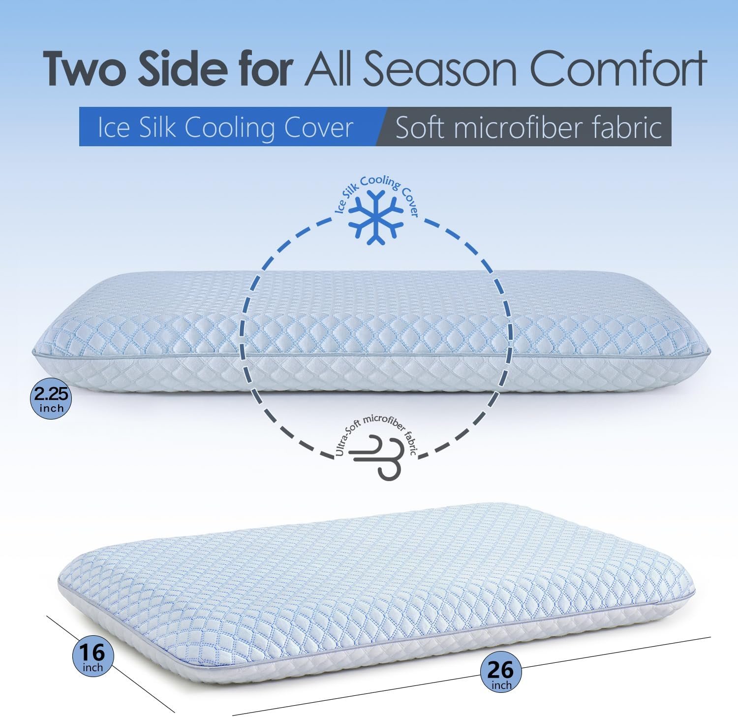 【Two Side for All Season Comfort】In addition to this cover(A cooling ice silk side to help dissipate body heat and A neutral side for Comfort), there will also be an additional Satin Envelope Pillow Cover.