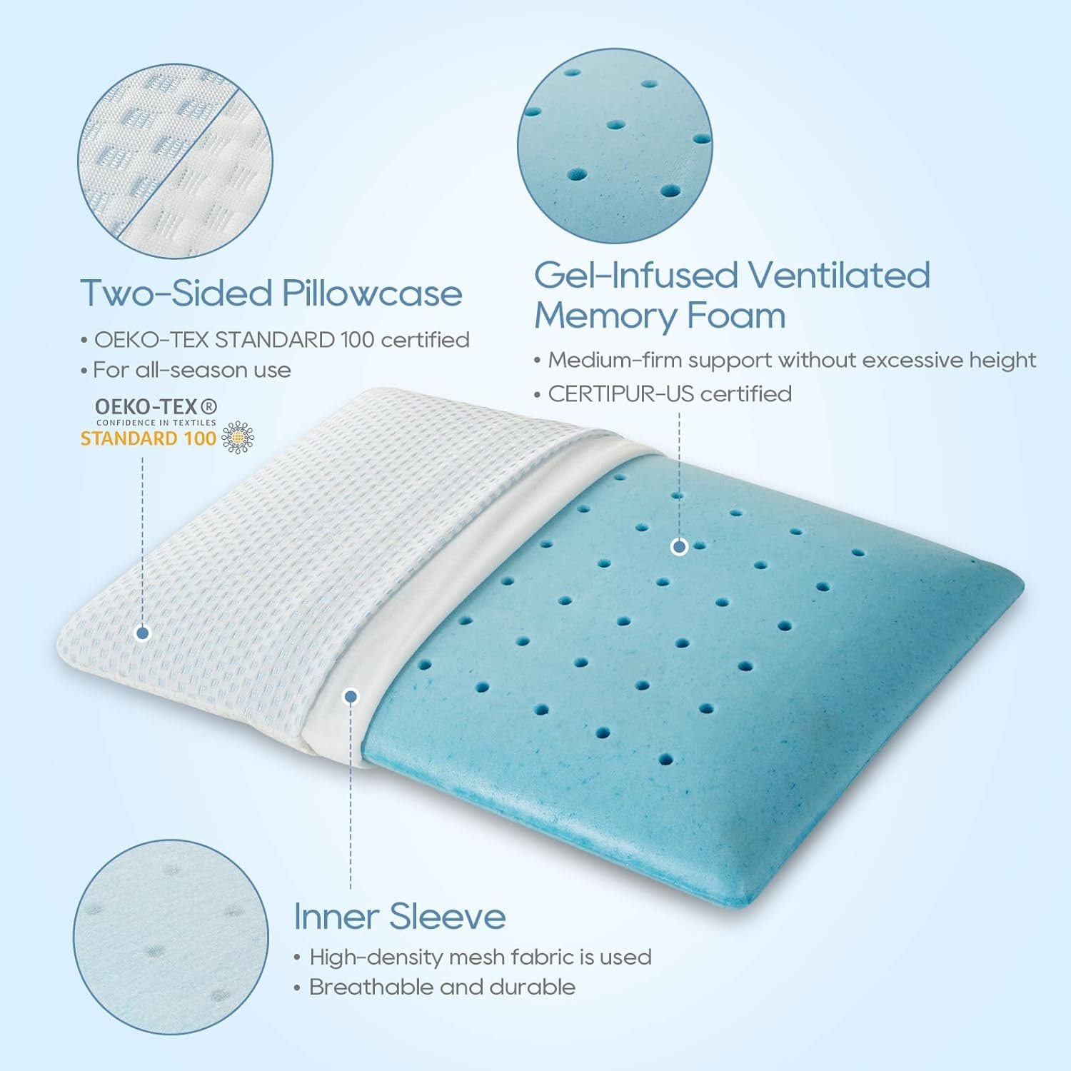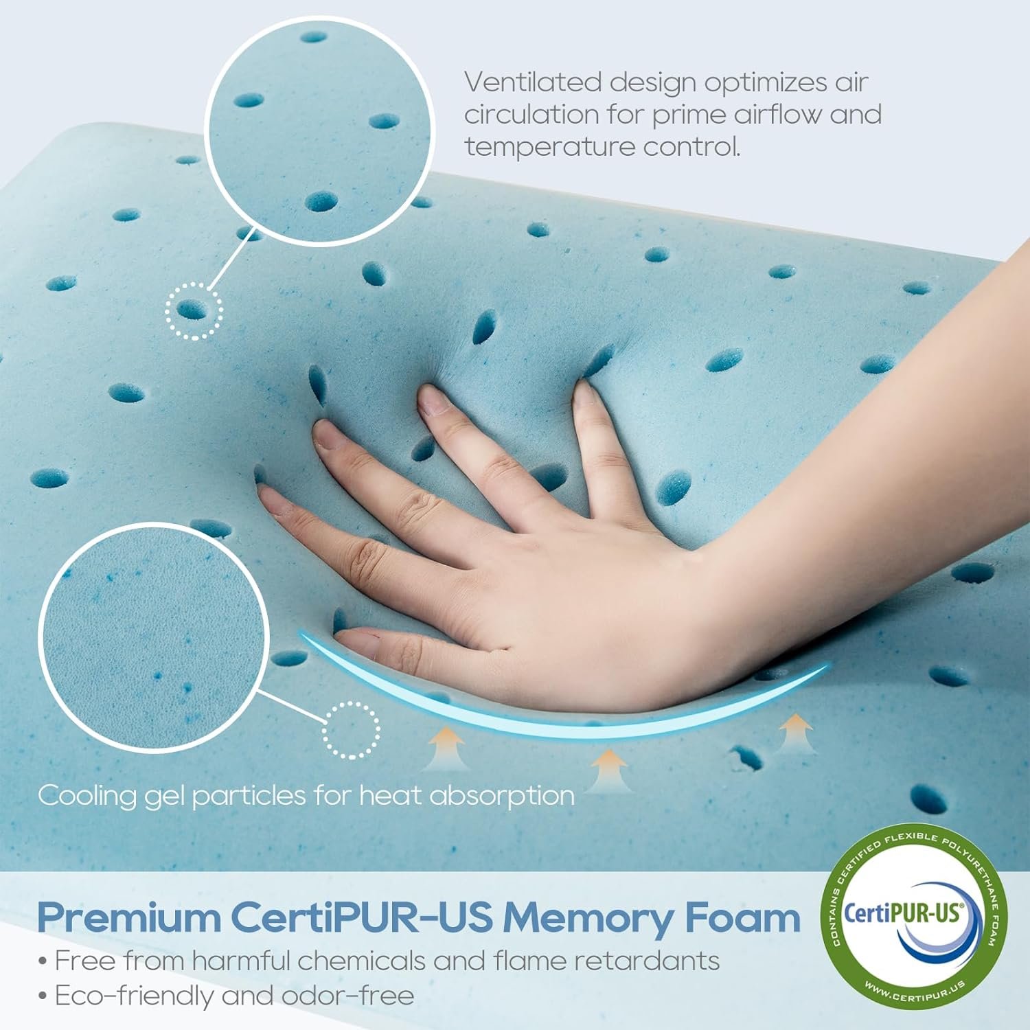 COOLING GEL INFUSED AND VENTILATED: Cooling gel particles, added for heat absorption, dissipate excessive heat away to prevent overheating. The Ventilated structure optimizes air circulation for superior airflow and temperature control, dissipates body heat better than traditional memory foam and keeps you cool and comfortable throughout the night. Premium mesh fabric is used to ensure that the inner sleeve is breathable and durable