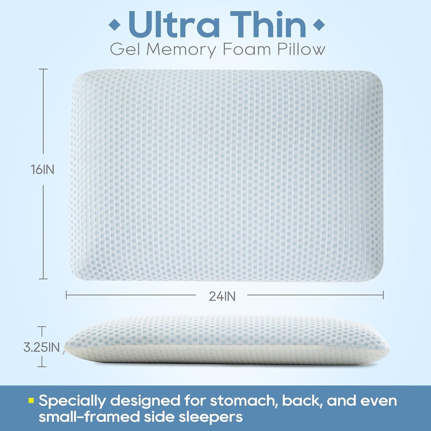Ultra Thin Pillow 3.25″ H Gel Memory Foam Flat Pillow for Stomach and Back Sleepers, Cooling Two-Sided Low Profile Bed Pillow for Stomach Sleeping, Slim Design for Cervical Neck Alignment and Support