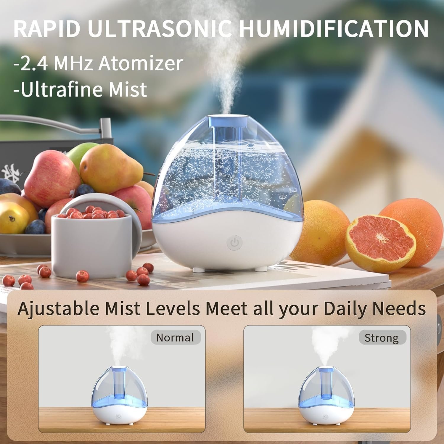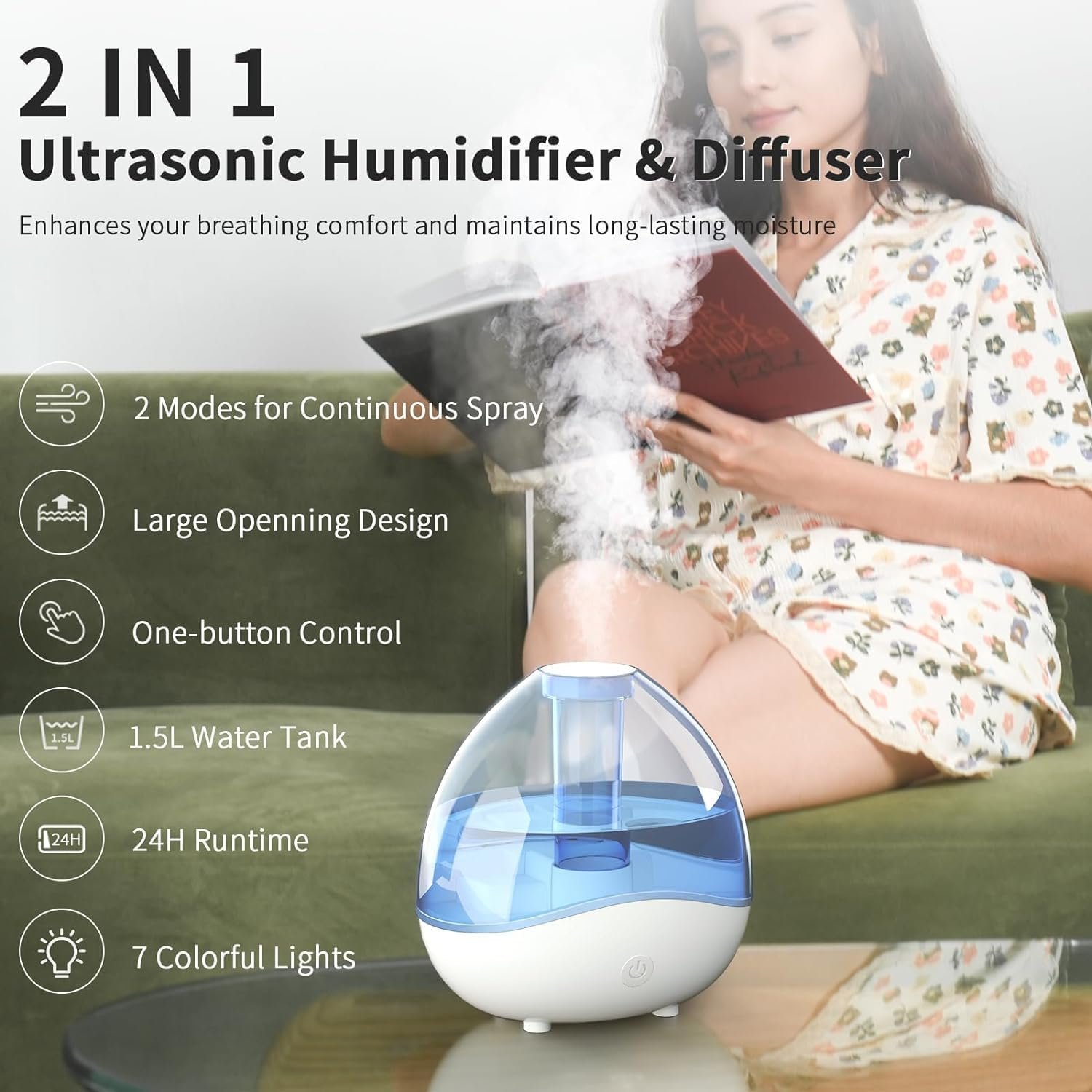 💦【Adjustable Mist Levels and Night Light】 Experience customizable and relaxed atmosphere with this humidifier! Choose from 2 mist levels and double click to turn on 7 soft ambient lights that automatically cycle. Perfect for home, room, office and living room.
