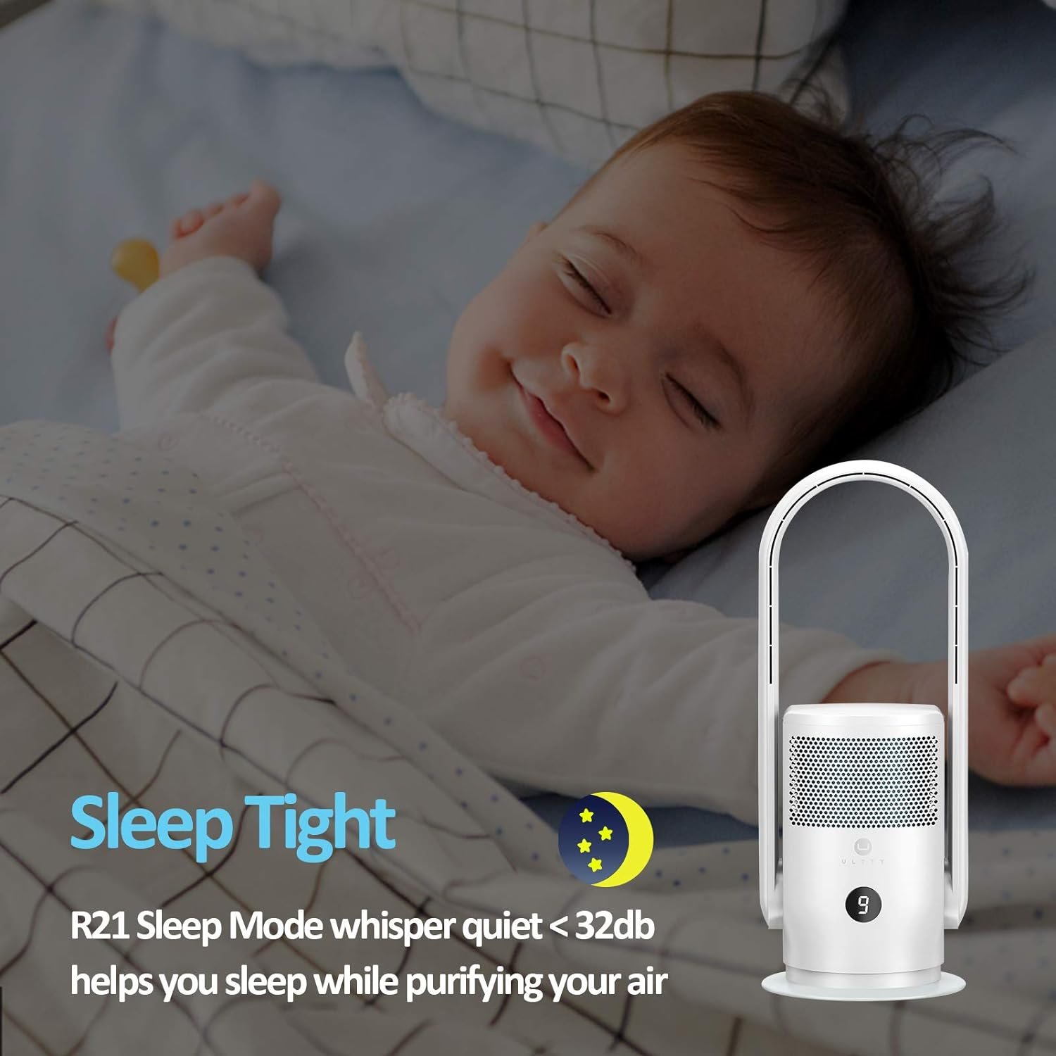 Lower Noise, More Serenity: Ultty bladeless fan adopts a unique air-duct design with fluid mechanics and minimize noise. Brings a comforting, cool, and ultra-quiet breeze, the LED dims after 2 mins while 8 H timer kicks off, giving you 12 hours of good sleep or deep nap at a noise lower to 32dB.