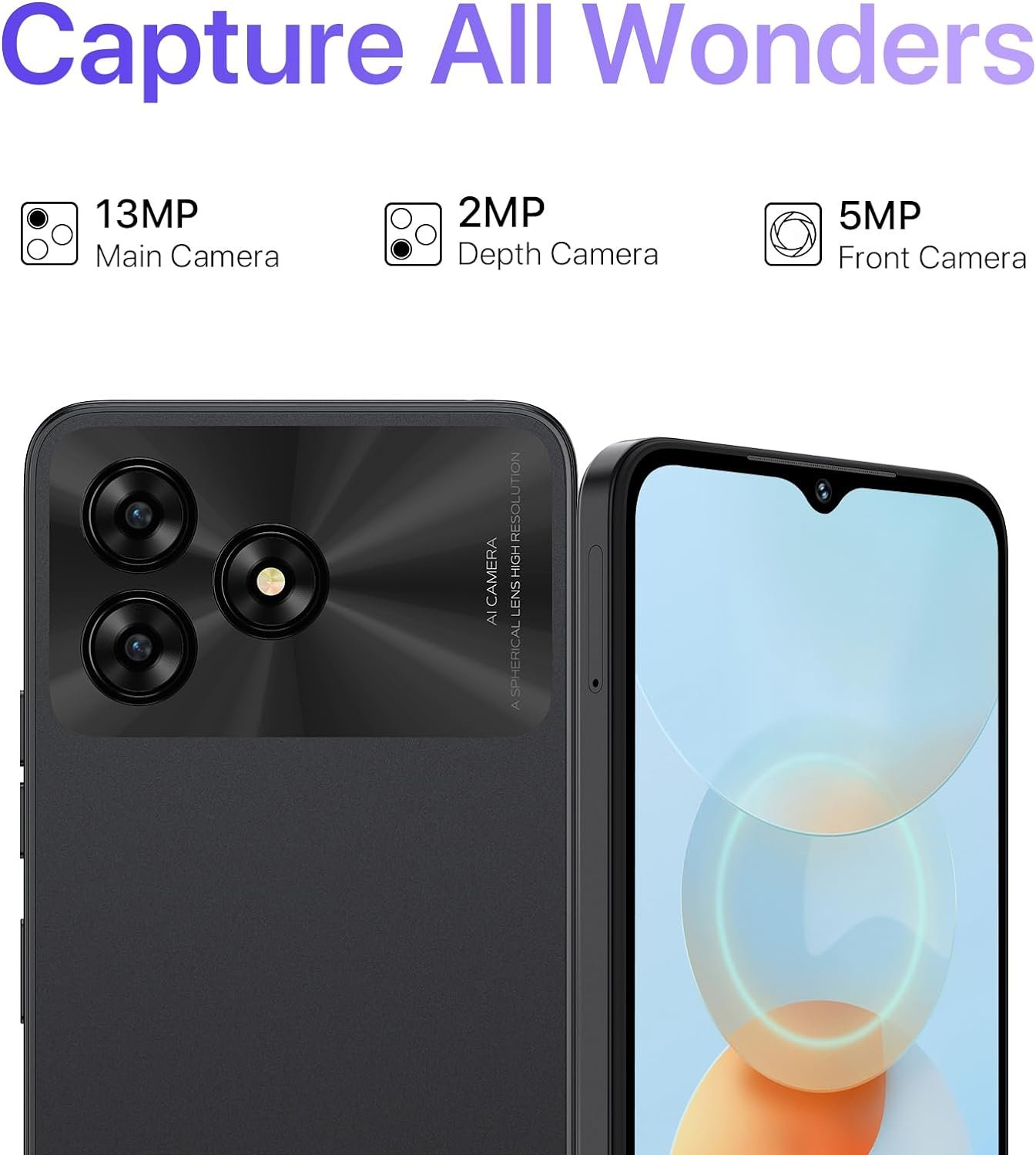【13MP+2MP+5MP Camera】13MP primary camera +2MP depth camera +5MP front camera, G5A smartphones can record the magnificent scenery in front of you, expand your horizons and show your beauty. Steady handheld night photography, Macro mode, portrait mode, HDR, AI beautify, face recognition, real-time filters, side-fingerprint sensor. Superior technology showing your subject more clearly.