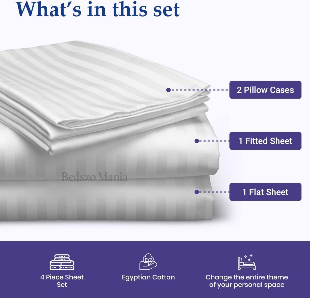 Some days we do not get enough sleep because of the bed and sheets set we sleep on. It may be too hot, too uncomfortable, itchy or rough to your skin causing restless nights. These 100% Egyptian Cotton sumptuous bed sheet set are a perfect solution for your home. CARE INSTRUCTIONS:- Machine wash in Cold Water, Do Not Bleach, Tumble Dry Low If Needed, Wash Dark Colors separately.