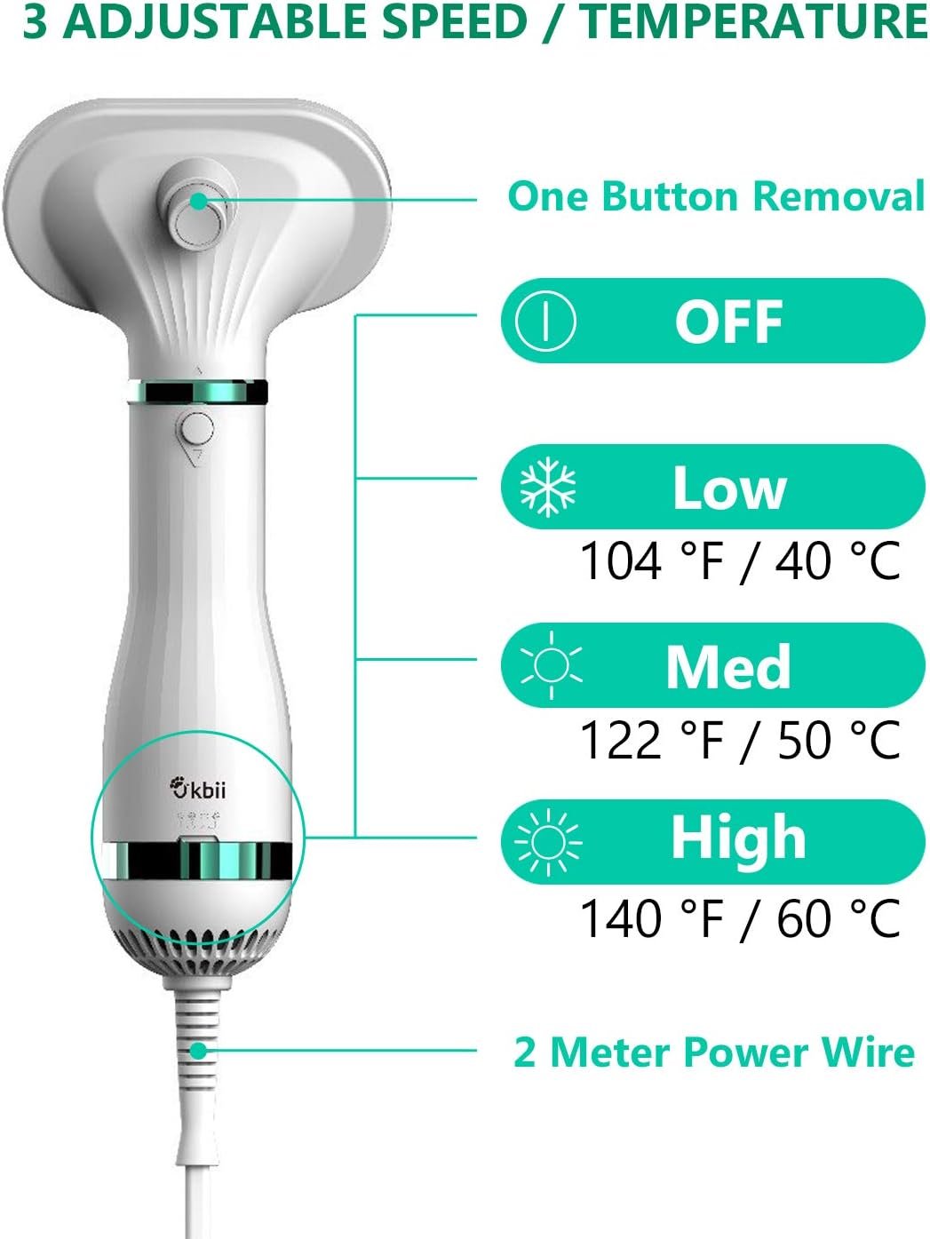 OKBII Upgraded Pet Hair Dryer ,The upgraded 2 IN 1 pet grooming dryer includes ONE-Button Pet Hair Removal, Exterior, 3 Temperature Speed Adjustable.